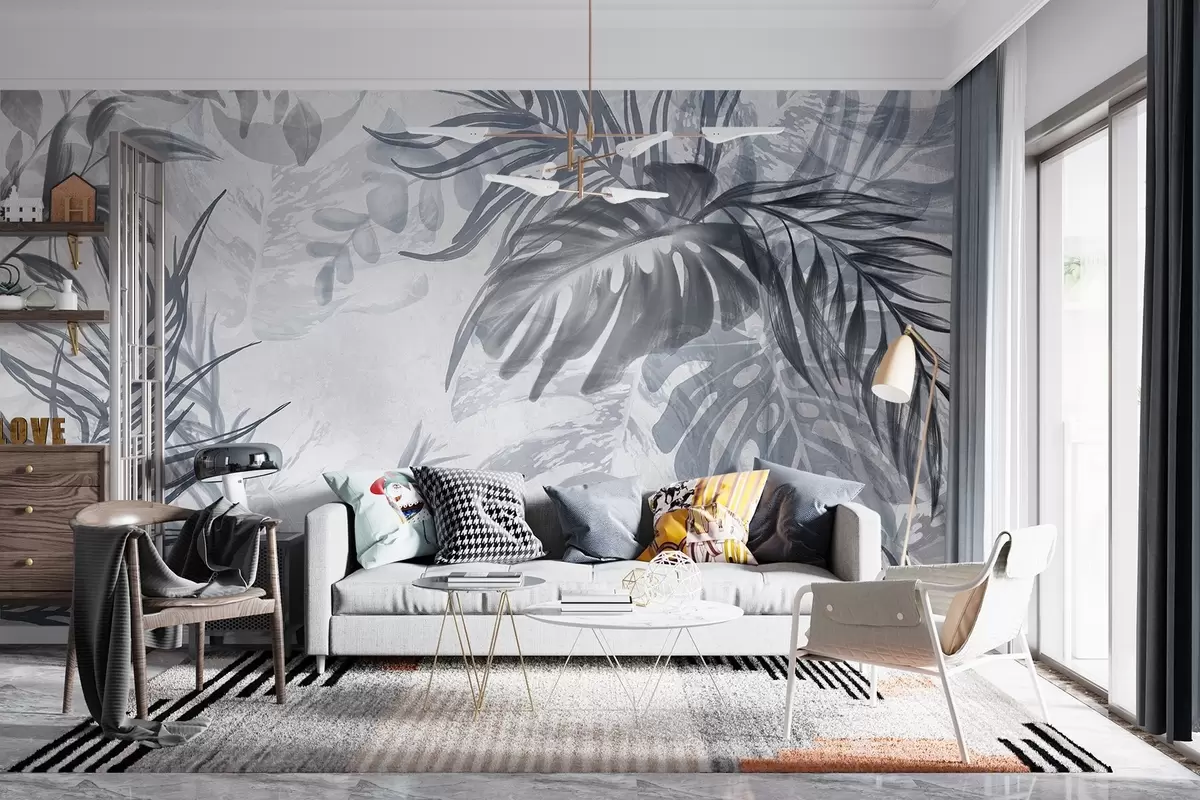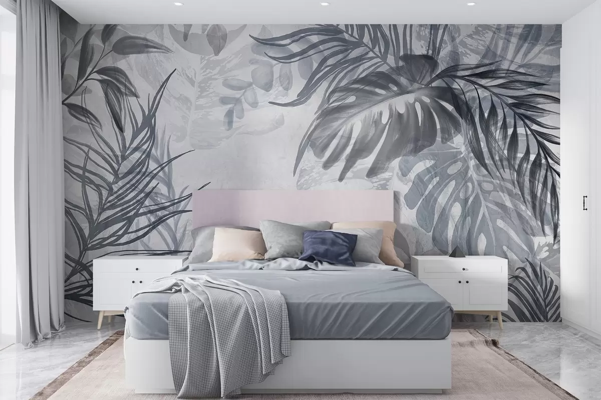 Fototapetes Monstera un palmu lapas zilos un pelēkos toņos, botānisks, tropu zaļumi, džungļu augi, teksturēts fons Nr. w09011v1