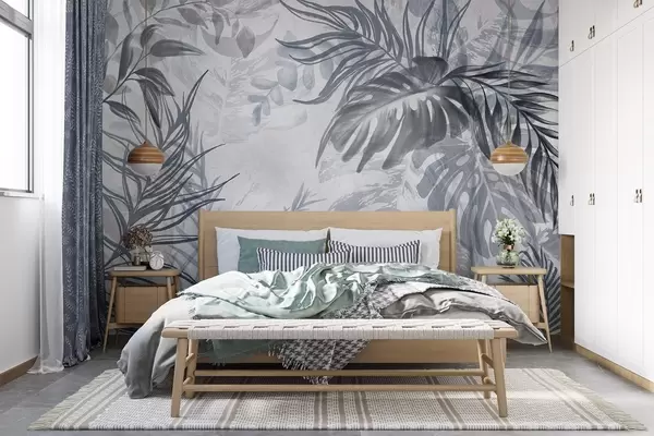 Fototapetes Monstera un palmu lapas zilos un pelēkos toņos, botānisks, tropu zaļumi, džungļu augi, teksturēts fons Nr. w09011v1