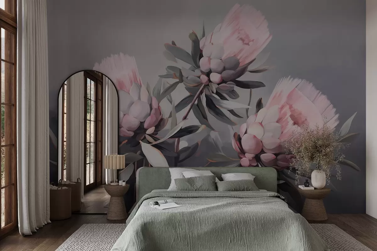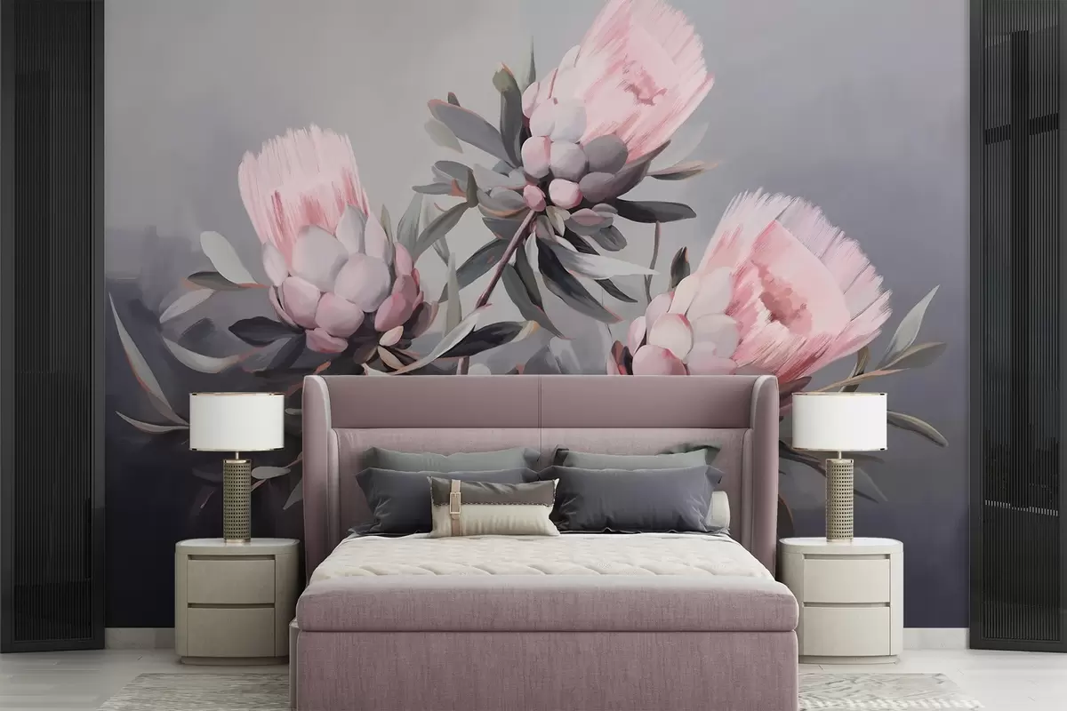 Fototapetes Rozā proteja abstraktie ziedi ar pelēkām lapām, mīksti teksturēti triepieni ar otu, izslēgtas krāsas, uz neskaidra pelēka fona Nr. w09014