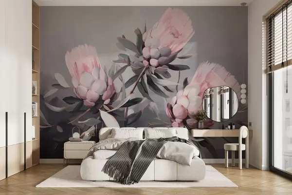 Fototapetes Rozā proteja abstraktie ziedi ar pelēkām lapām, mīksti teksturēti triepieni ar otu, izslēgtas krāsas, uz neskaidra pelēka fona Nr. w09014
