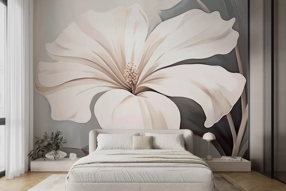 Fototapetes Liels balts zieds ar ziedlapiņām uz zili pelēka fona Nr. w09033