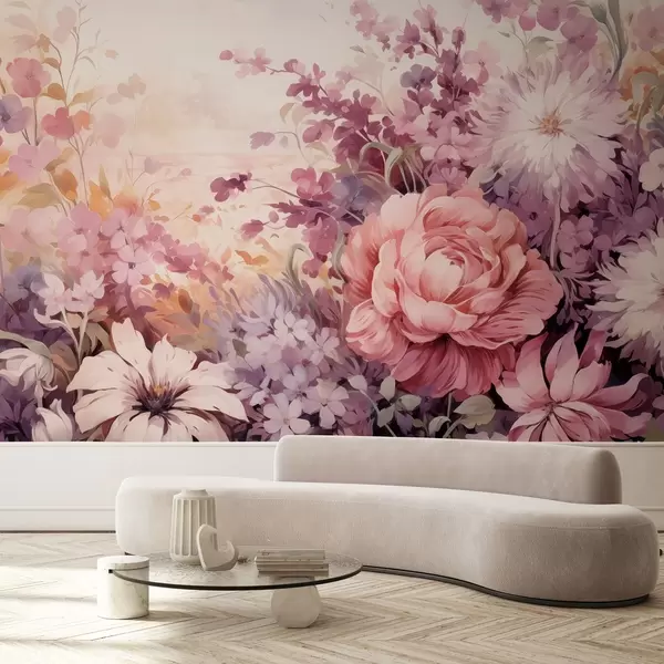 Fototapetes Krāsaini ziedi rozā un violetos toņos: ceriņi, peonijas, krizantēmas Nr. w09039
