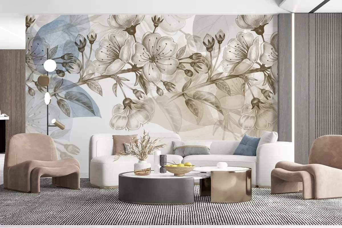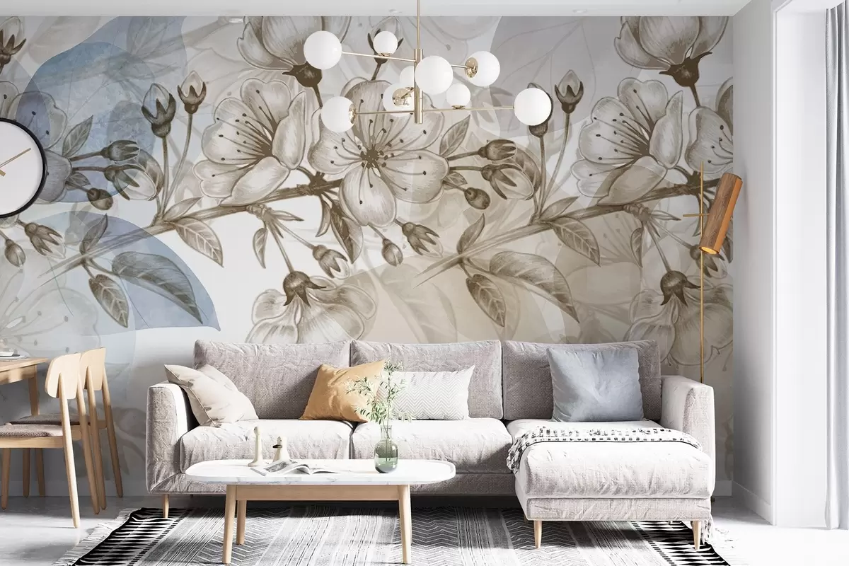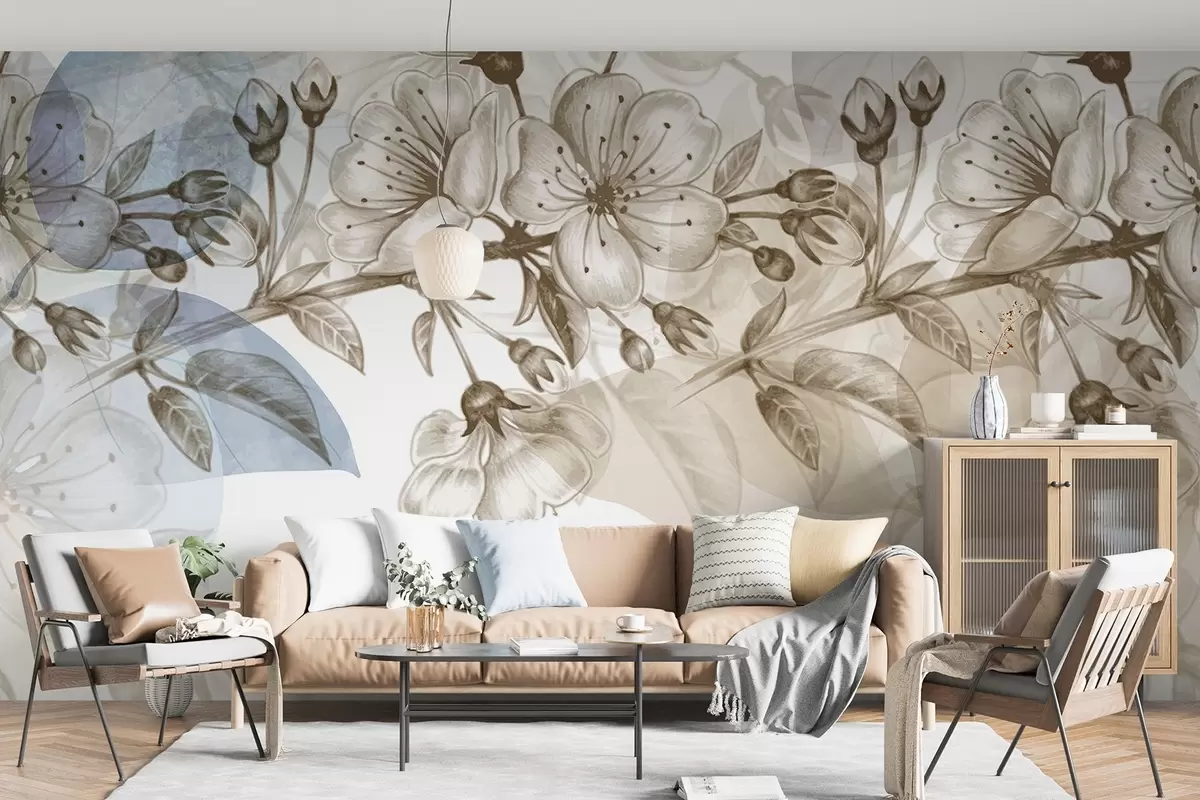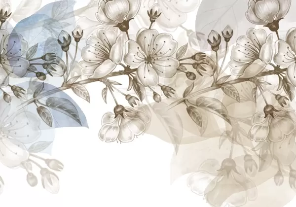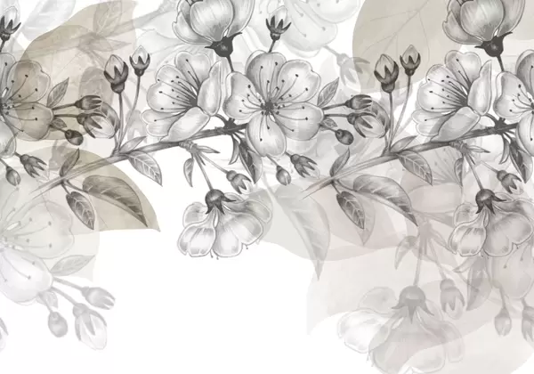 Fototapetes Ķiršu ziedu zars ar ziediem un pumpuriem, sepijas toņi, mīksts akvarelis līdzīgs fons ar ziliem un brūniem toņiem Nr. w09051
