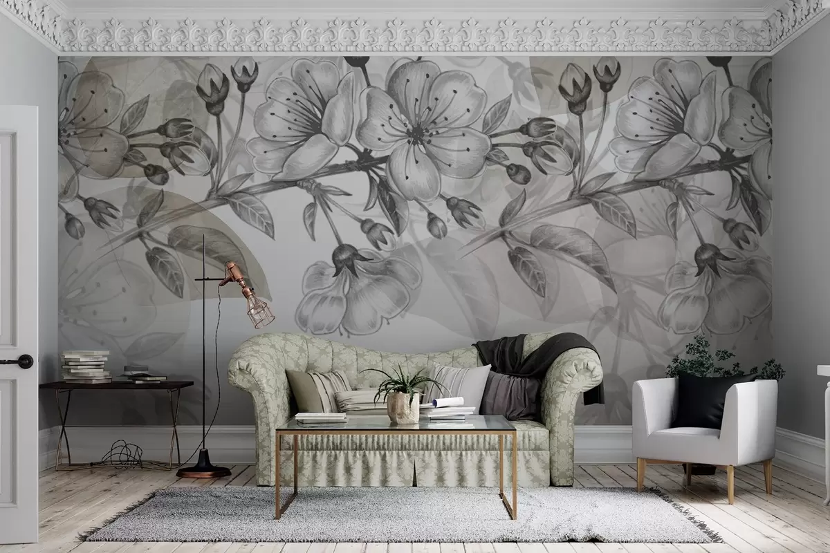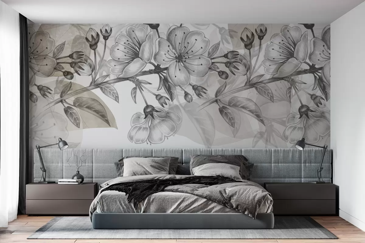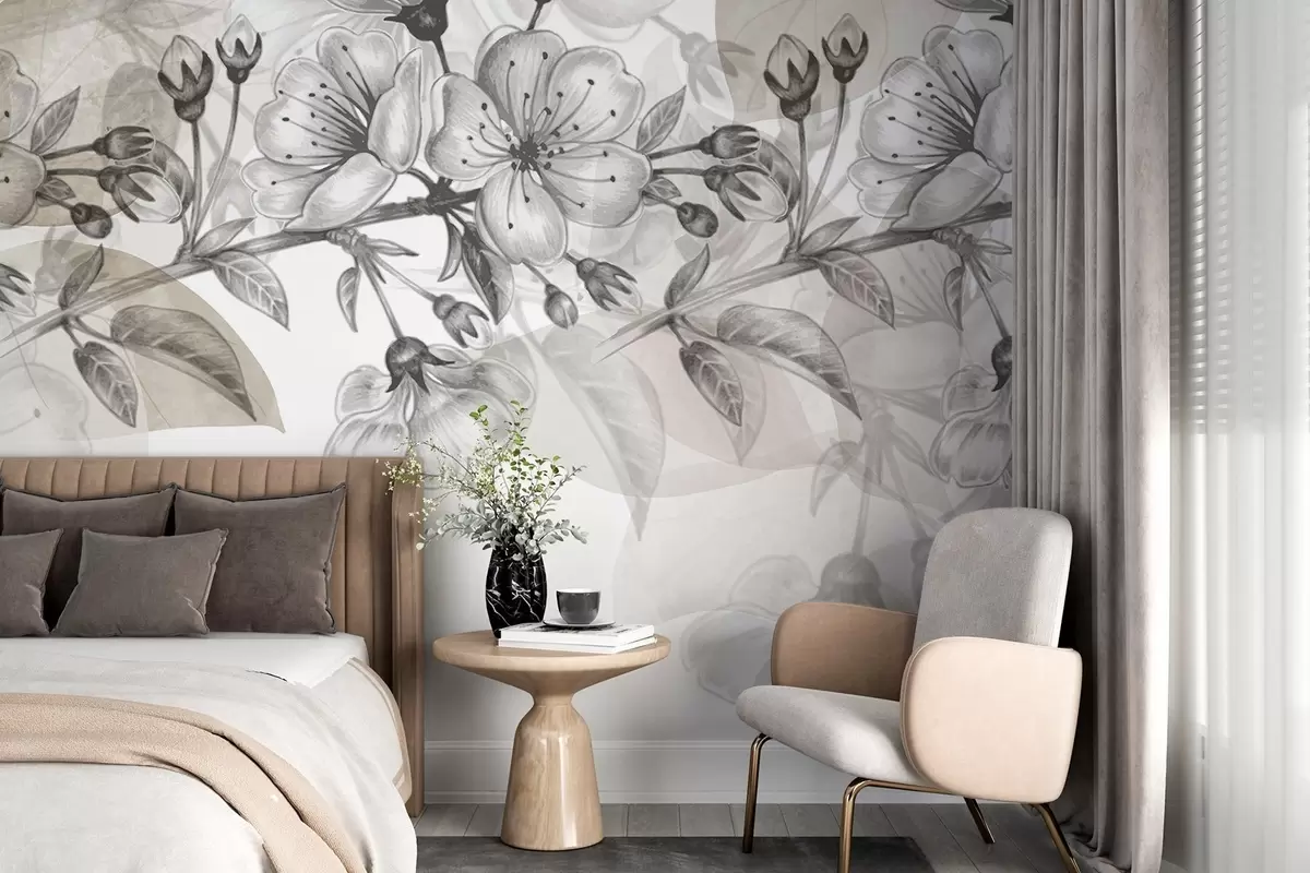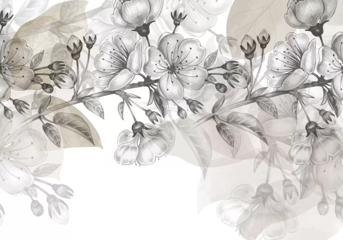 Fototapetes Ķiršu ziedu zars ar ziediem un pumpuriem, sepijas toņi, mīksts akvarelis līdzīgs fons ar pelēkiem un brūniem toņiem Nr. w09051v1