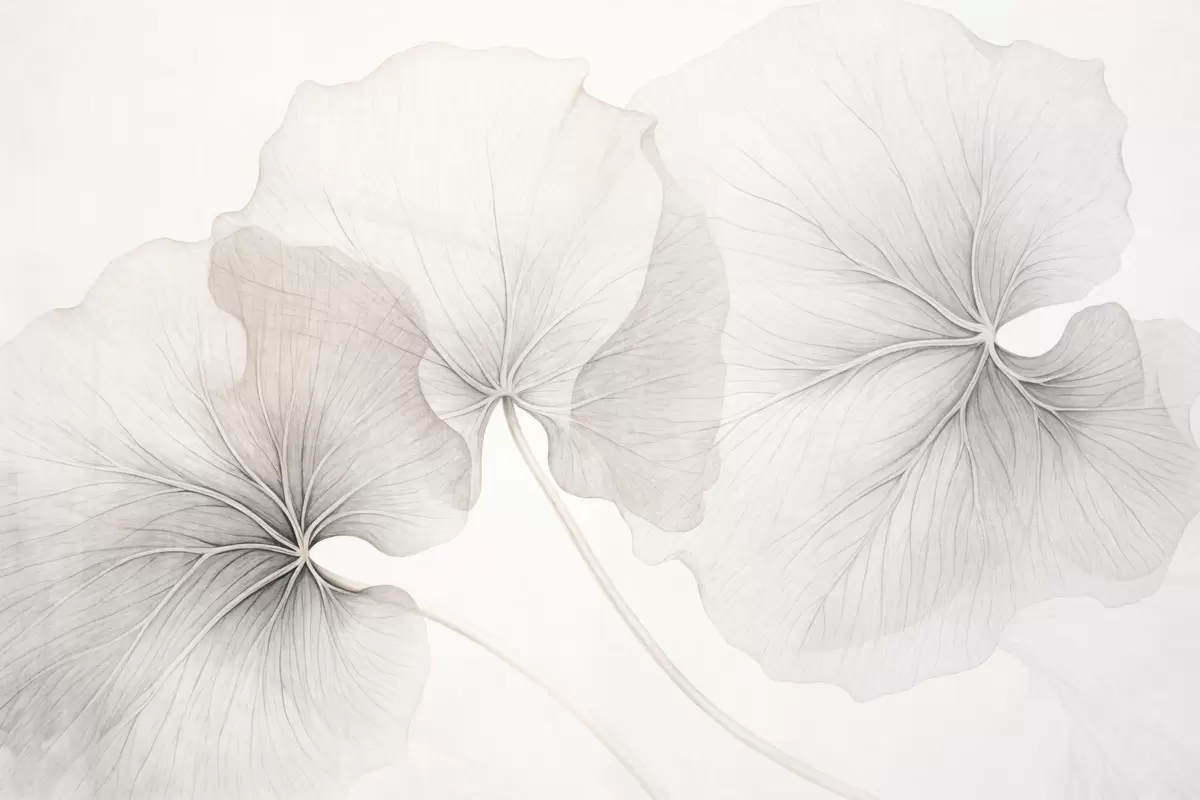 Fototapetes Trīs caurspīdīgas lapas ar redzamām dzīslām, ar trokšņainu tekstūru, kas nedaudz pārklājas, ar plāniem kātiņiem uz balta fona Nr. w09052
