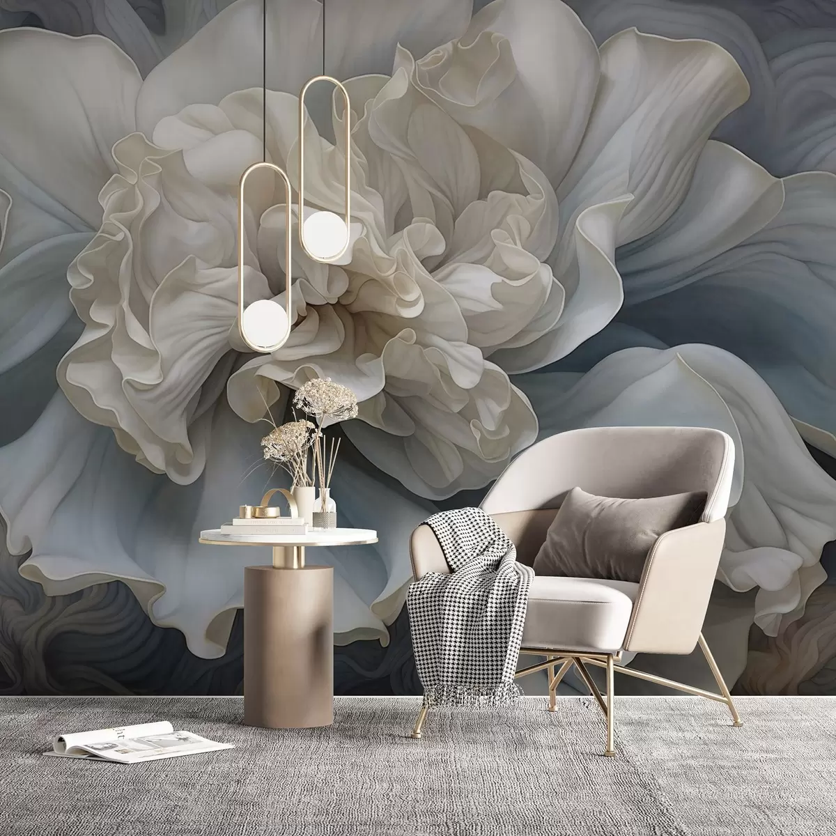 Fototapetes Abstrakts liels dekoratīvs zieds ar daudzām ziedlapiņām, mīksts un maigs, ar ziliem un pelēkiem toņiem fonā Nr. w09055