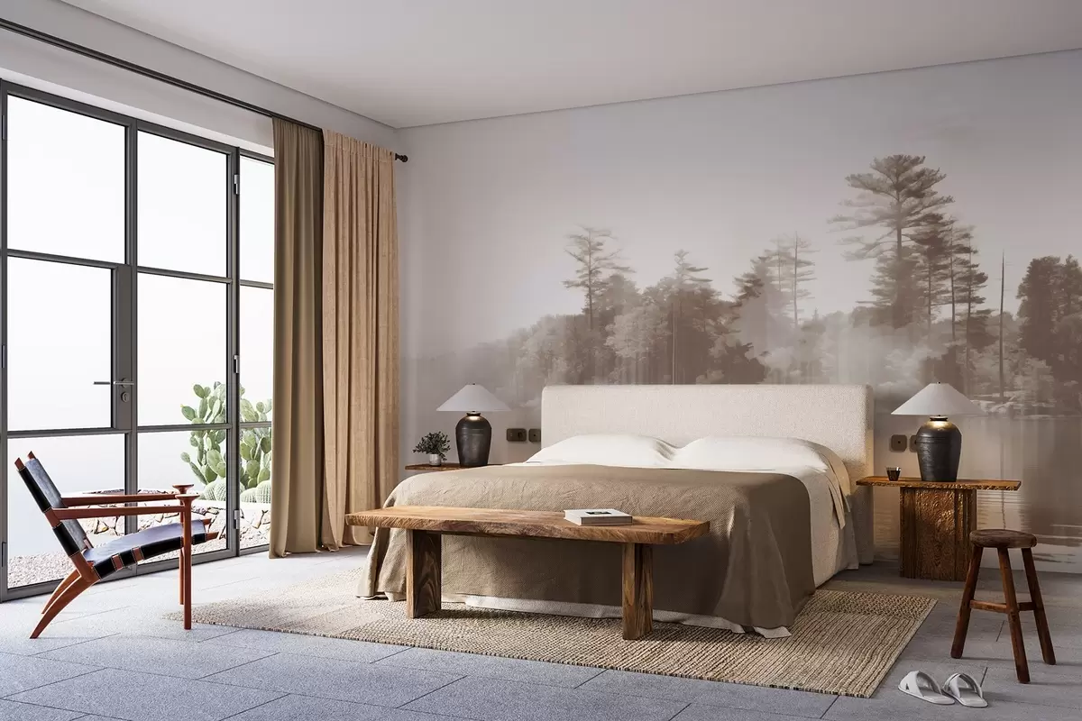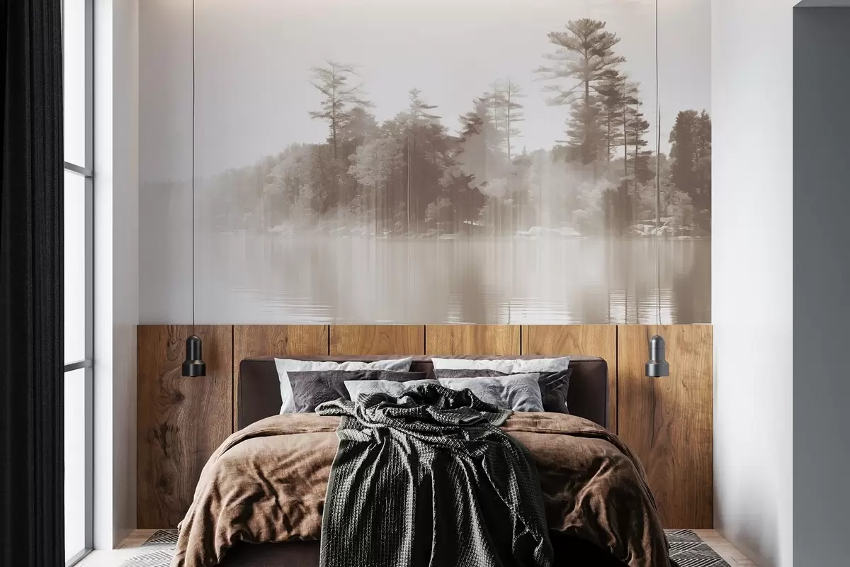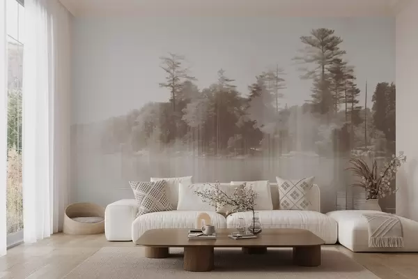 Fototapetes Abstrakti minimālisma minimālisma faktūras ainava ar ezeru un koku atspulgiem ūdenī bēšos un baltos toņos Nr. w09058v1
