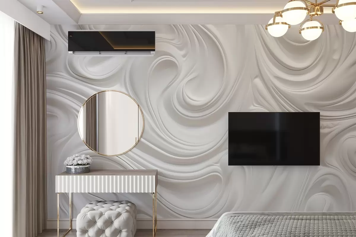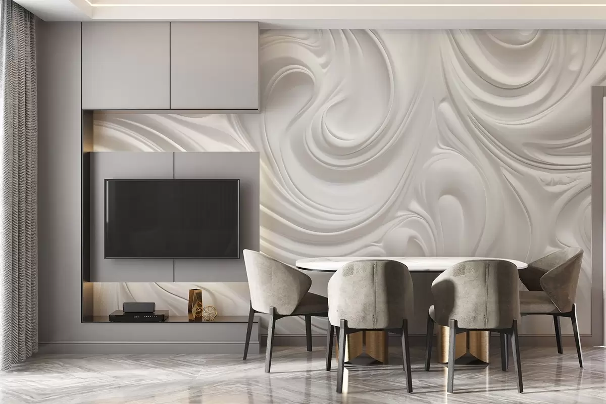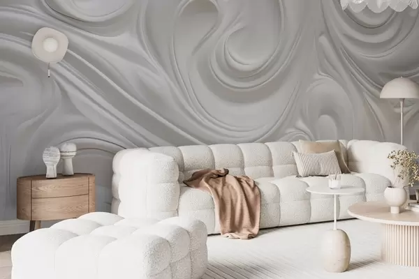 Fototapetes Balta abstraktā modernā māksla ar plūstošiem virpuļiem un viļņiem, gluda tekstūra, elegants dizains, minimālisma estētika Nr. w09059