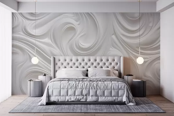 Fototapetes Balta abstraktā modernā māksla ar plūstošiem virpuļiem un viļņiem, gluda tekstūra, elegants dizains, minimālisma estētika Nr. w09059