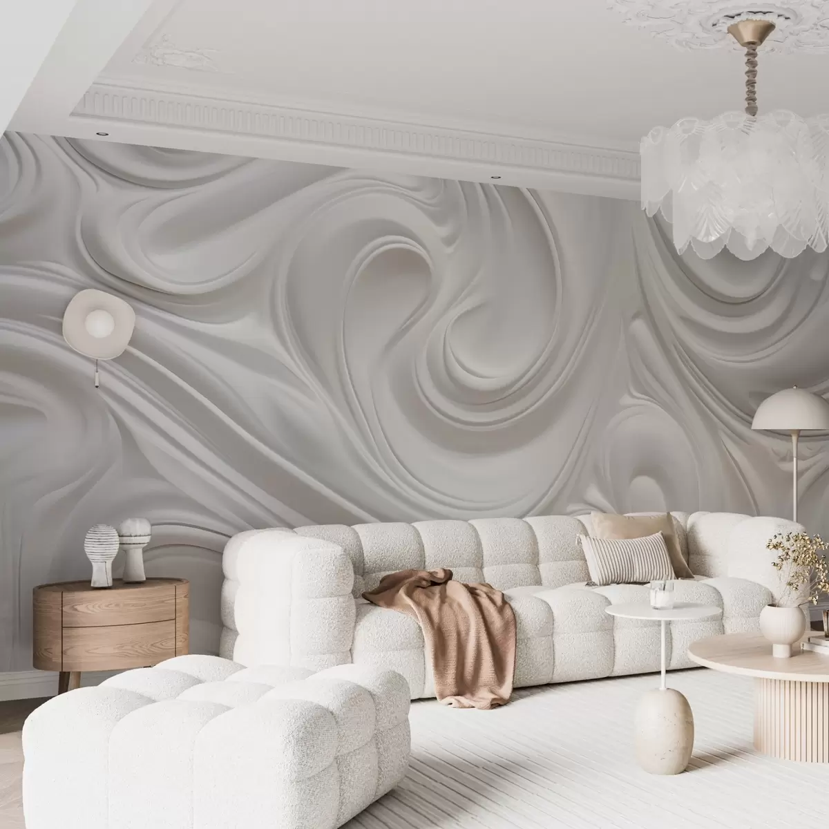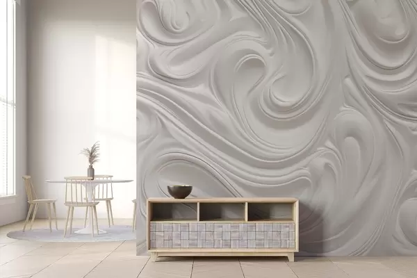 Fototapetes Balta abstraktā modernā māksla ar plūstošiem virpuļiem un viļņiem, gluda tekstūra, elegants dizains, minimālisma estētika Nr. w09059