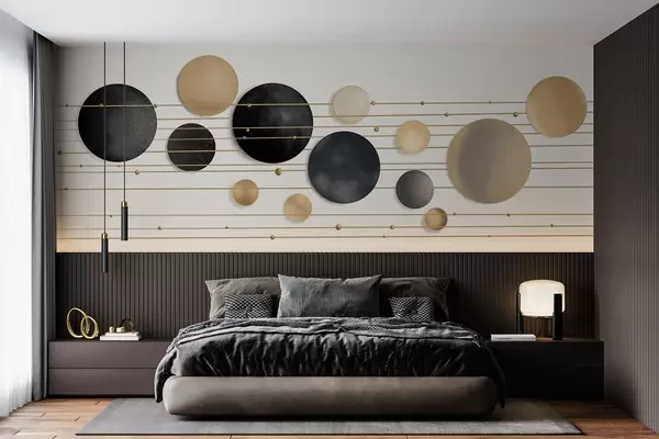 Fototapetes Abstrakts moderns dizains ar teksturētiem apļiem baltā, dzeltenā un pelēkā tonī, ko savieno plānas līnijas, minimālisma māksla Nr. w09060