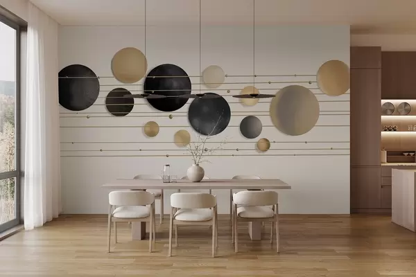 Fototapetes Abstrakts moderns dizains ar teksturētiem apļiem baltā, dzeltenā un pelēkā tonī, ko savieno plānas līnijas, minimālisma māksla Nr. w09060