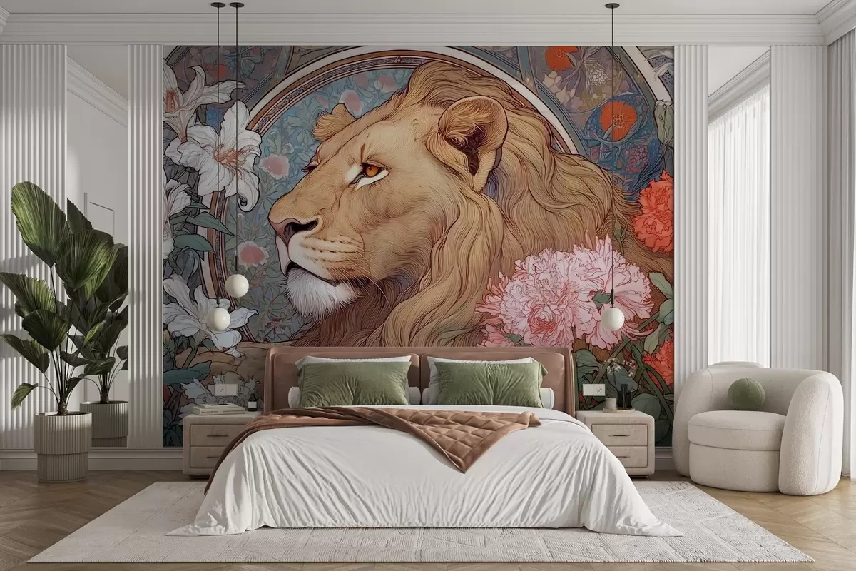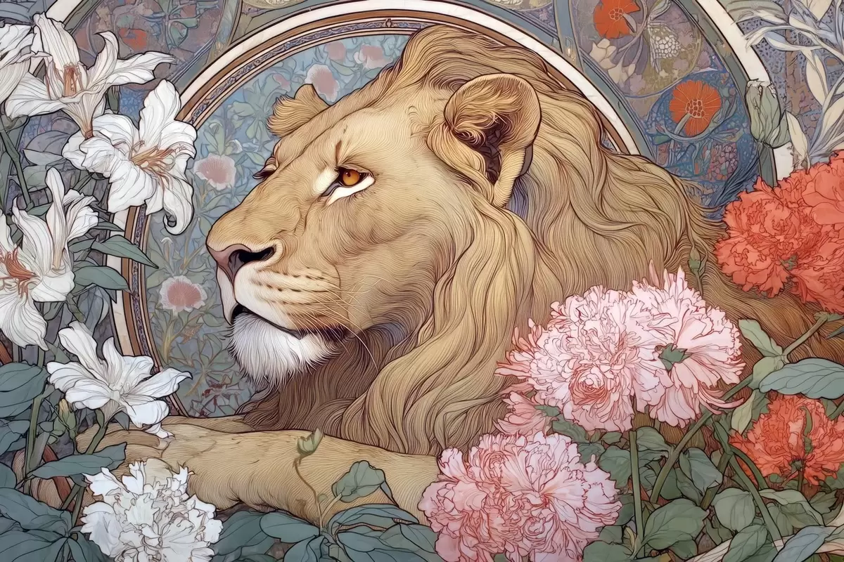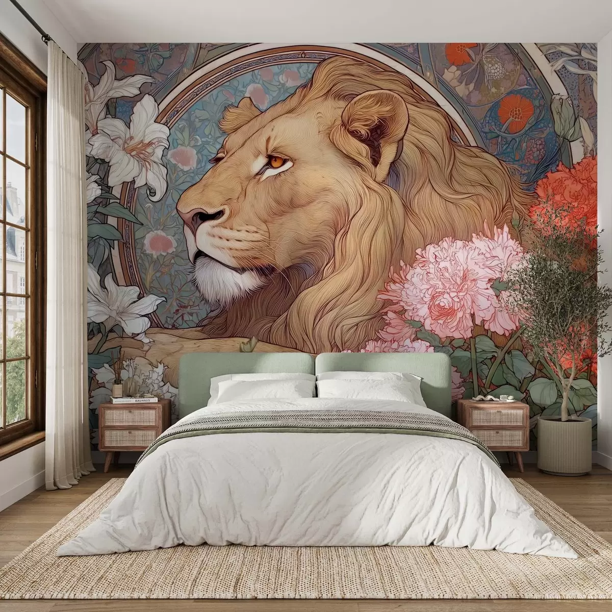 Fototapetes Lauva daudzu ziedu ieskautā Alphonse Mucha stilā Nr. w09073