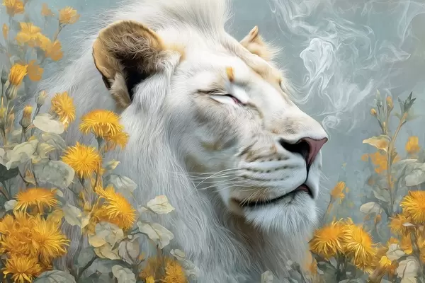Fototapetes Balts lauva, ko ieskauj dzelteni ziedi un dūmi Nr. w09080