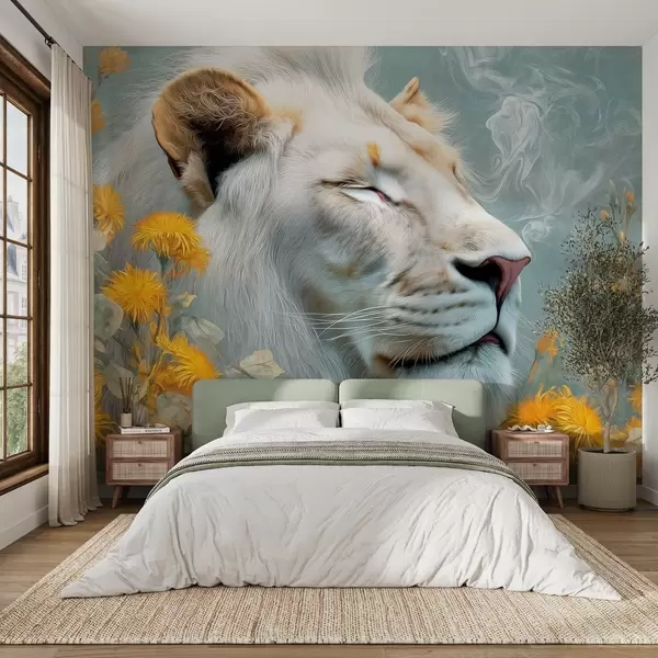Fototapetes Balts lauva, ko ieskauj dzelteni ziedi un dūmi Nr. w09080