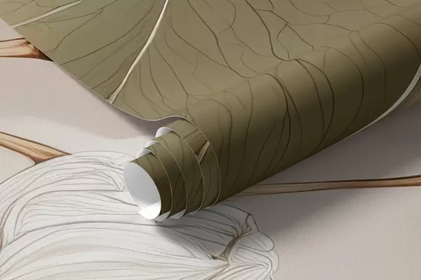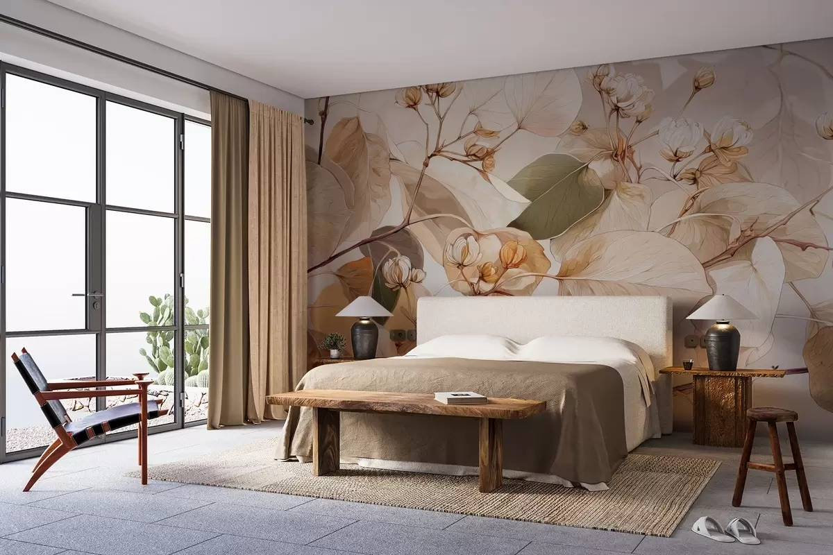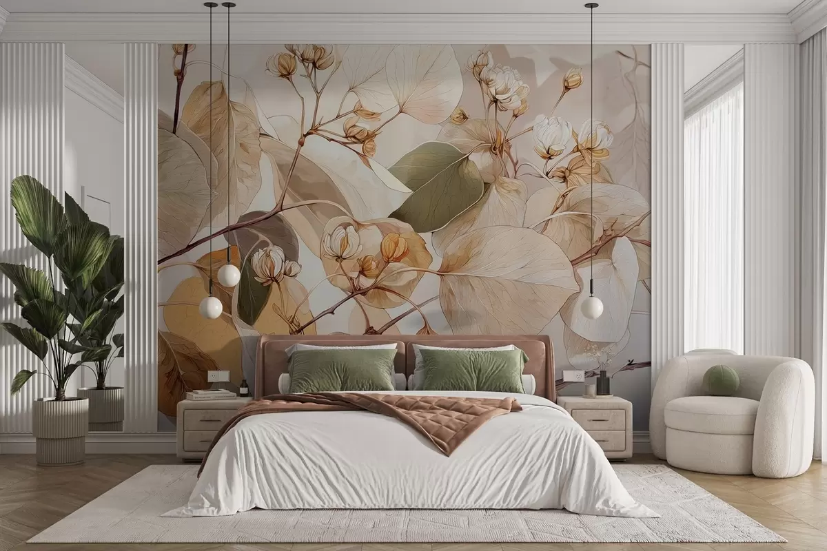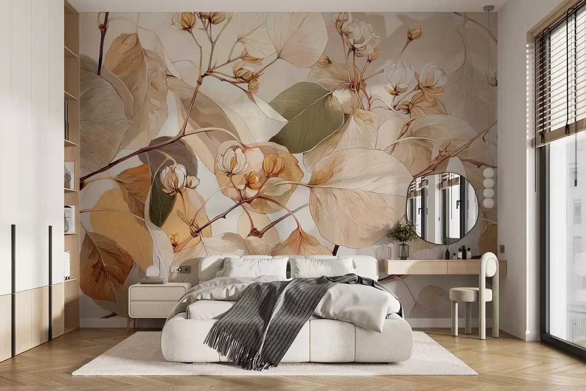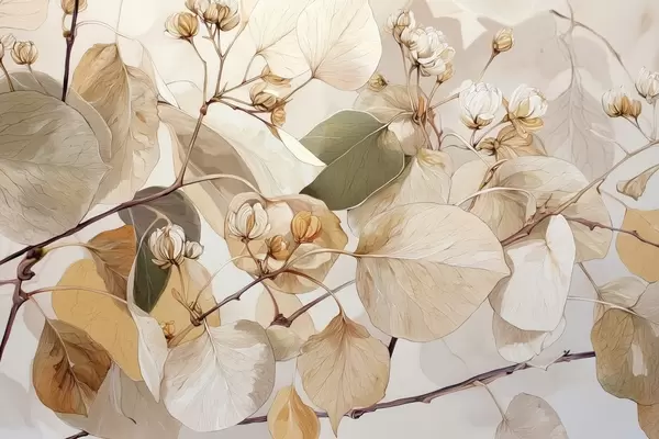 Fototapetes Apšu lapu un ziedu zari eļļas gleznošanas stilā bēšos toņos Nr. w09082
