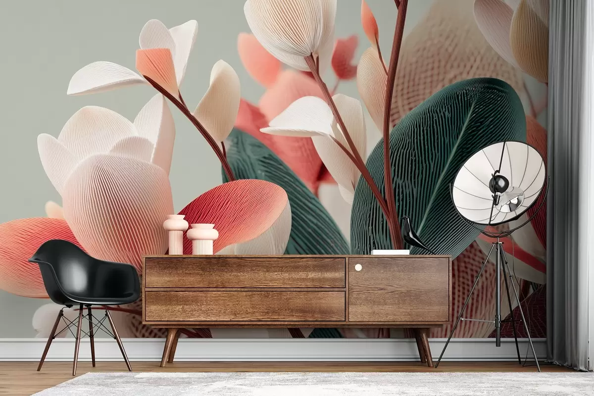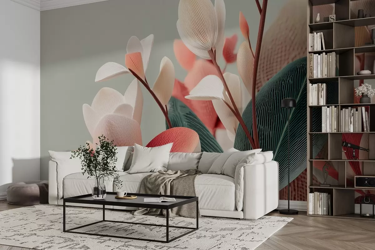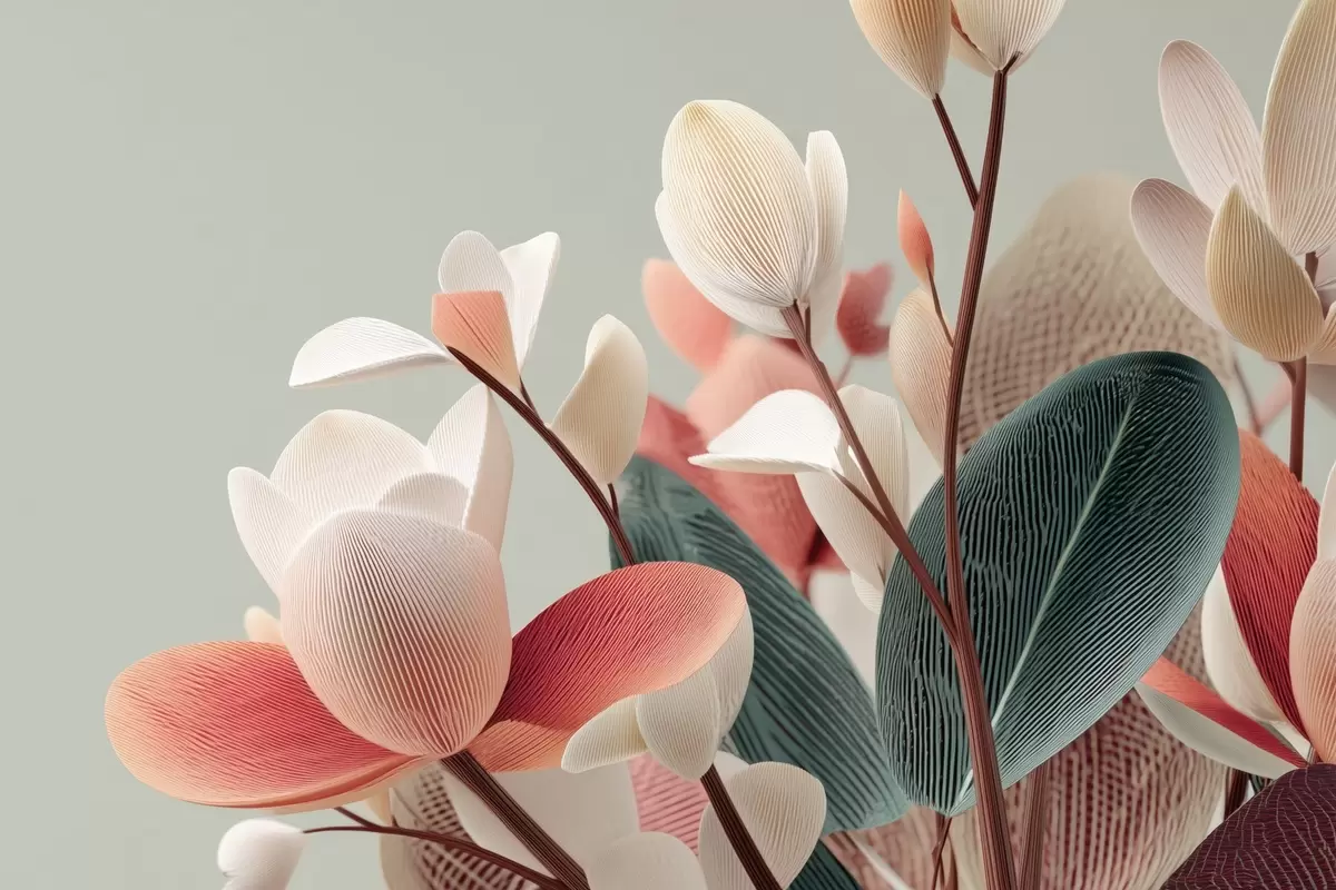 Fototapetes Teksturēti ziedi un lapas pasteļtoņos un zaļos toņos Nr. w09094