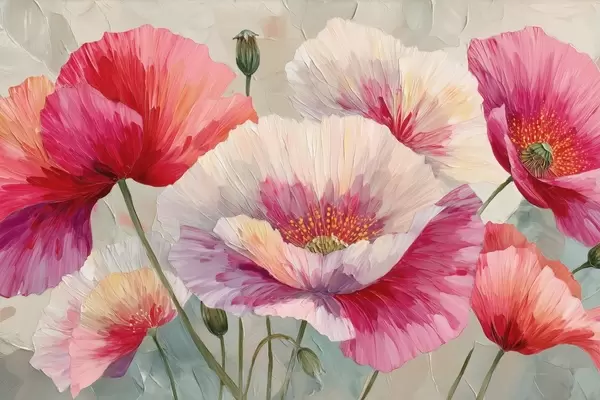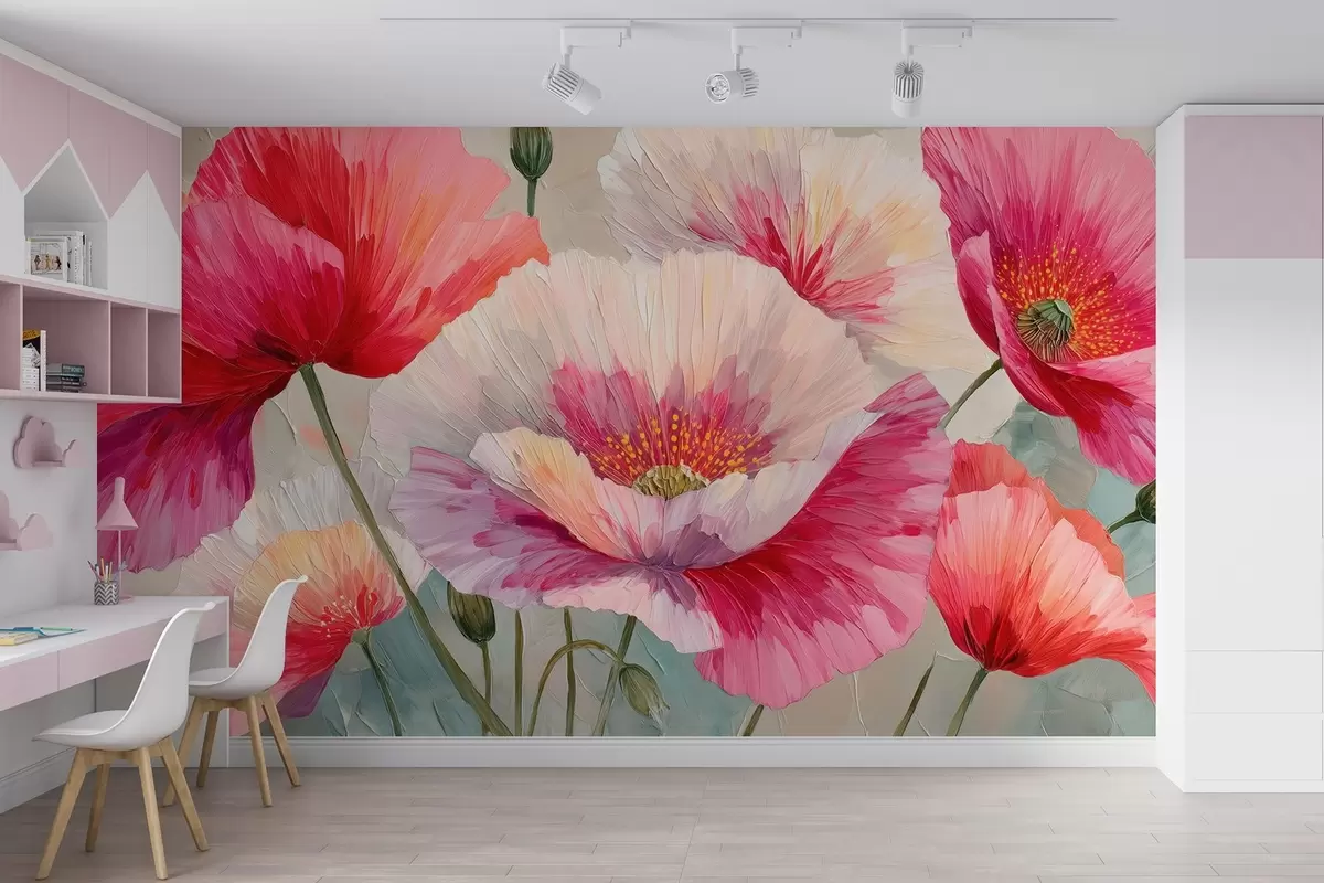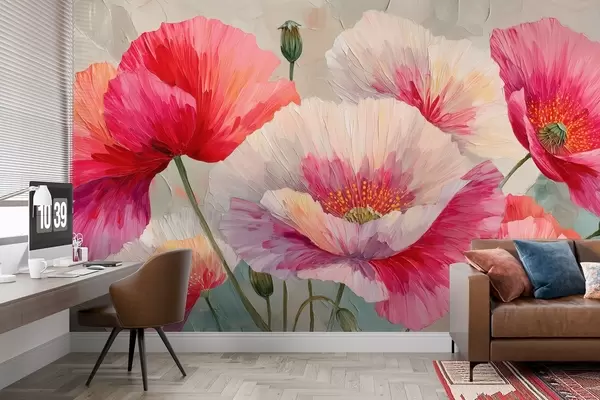 Fototapetes Baltās un sarkanās magones eļļas glezniecības stilā ar drosmīgiem triepieniem ar otu Nr. w09097