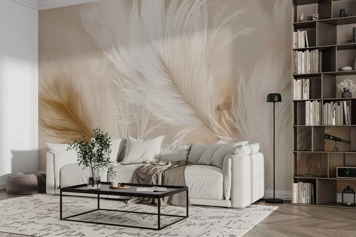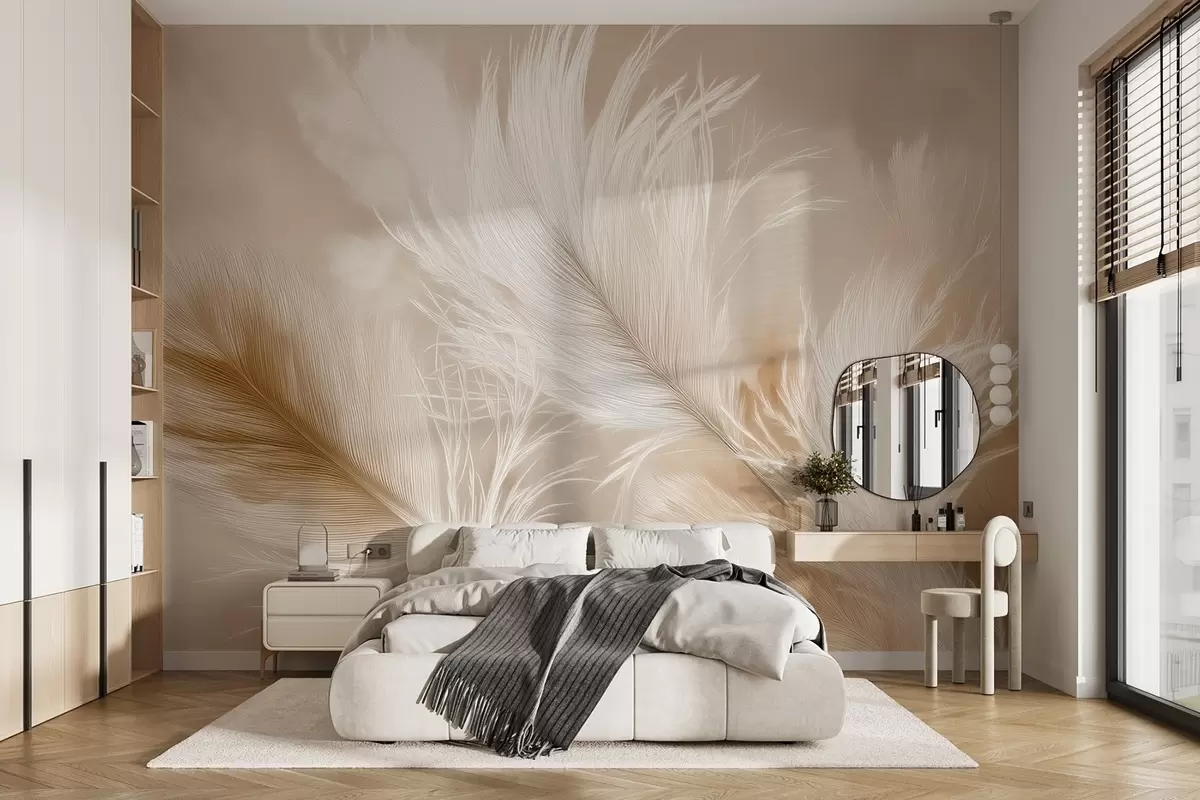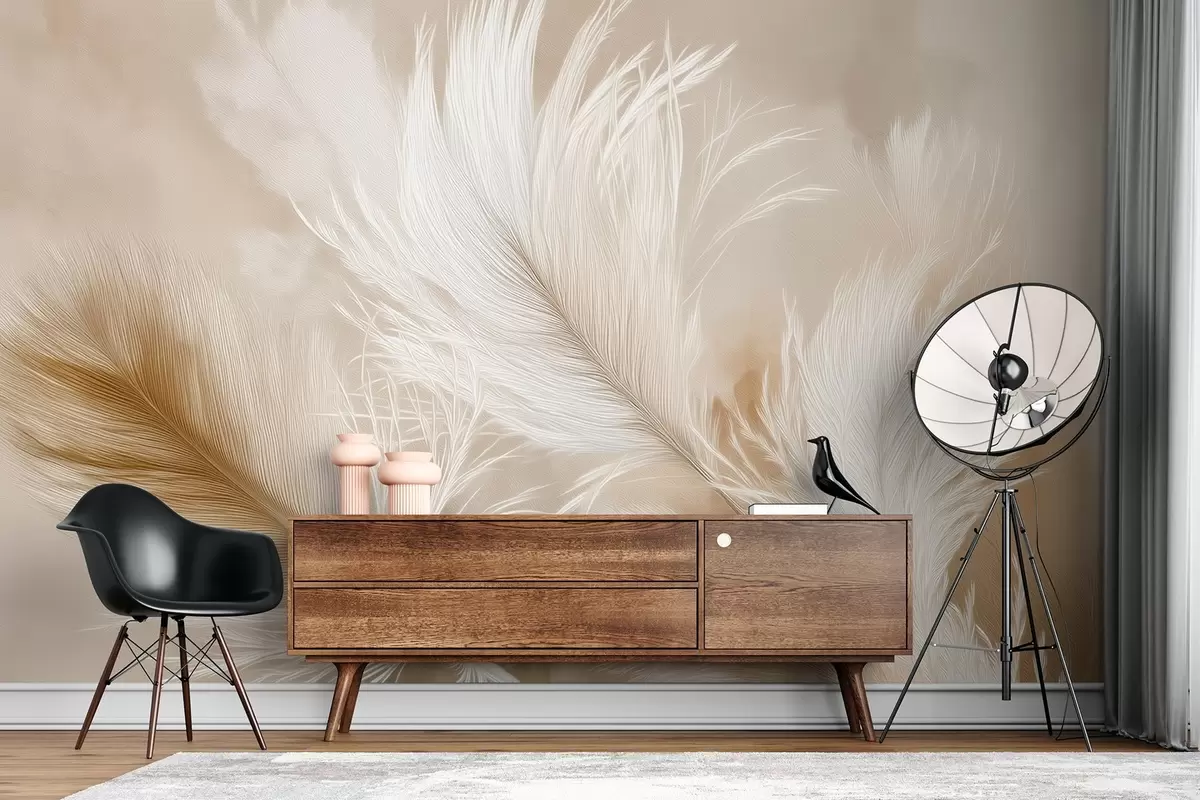 Fototapetes Lidojošas gaisīgas spalvas uz bēša fona Nr. w09102