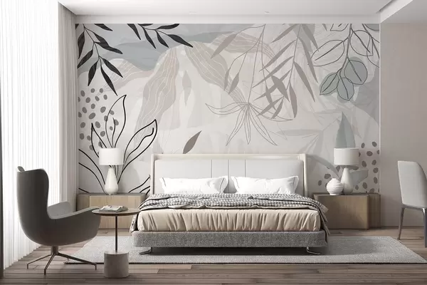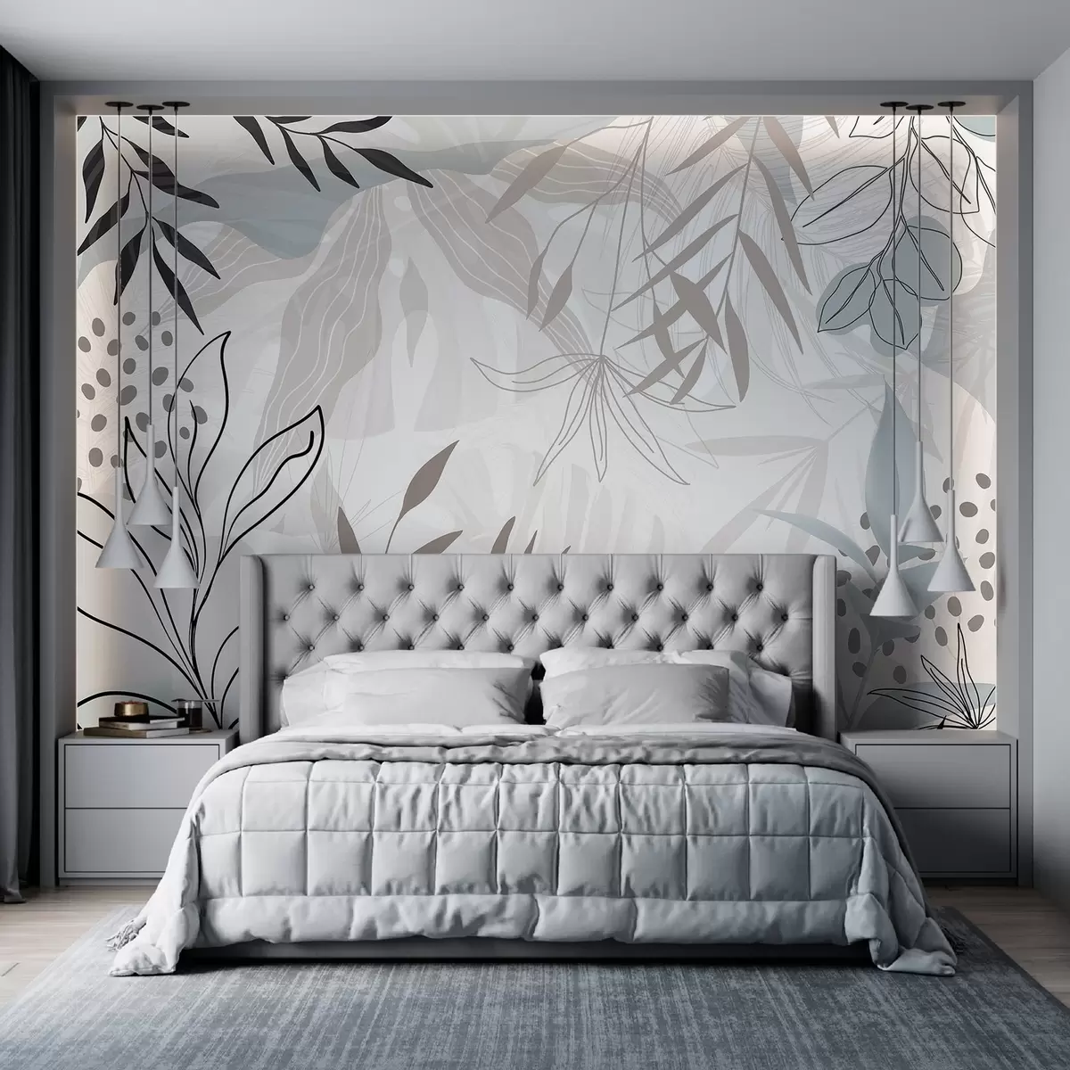 Fototapetes Abstrakts ziedu moderns dizains ar pasteļkrāsas smilškrāsas, pelēkām, zilām un melnām lapām, smalku līniju mākslu un maigu fonu Nr. w09105
