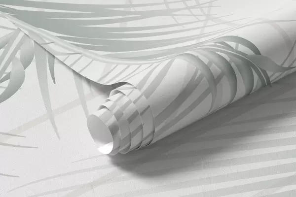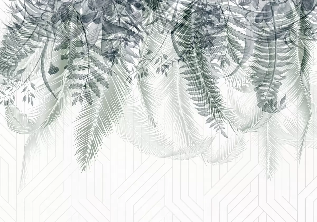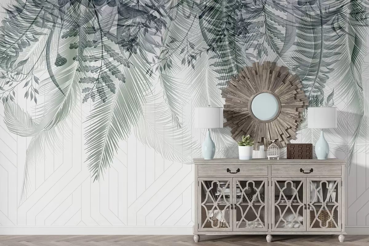 Fototapetes Smalks tropu papardes un palmu lapu kritums, ģeometriskais fons, maiga gaisma, pieklusinātas krāsas, elegants Nr. w09106