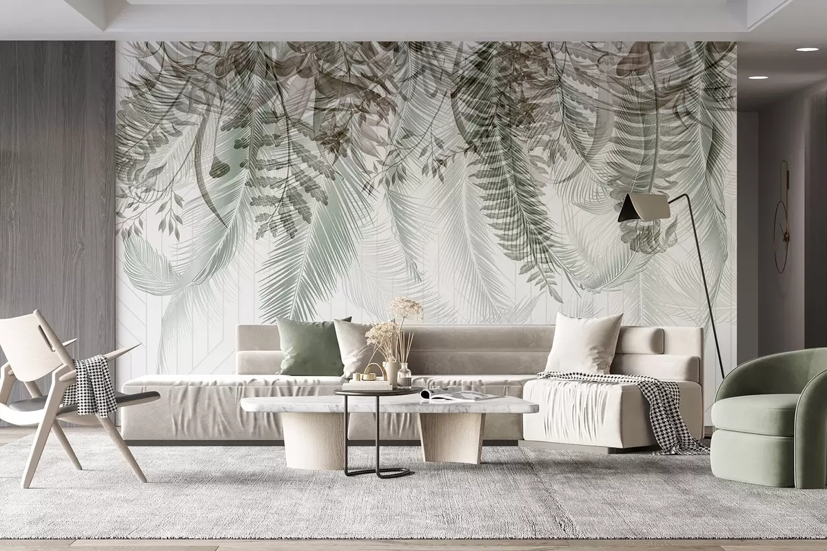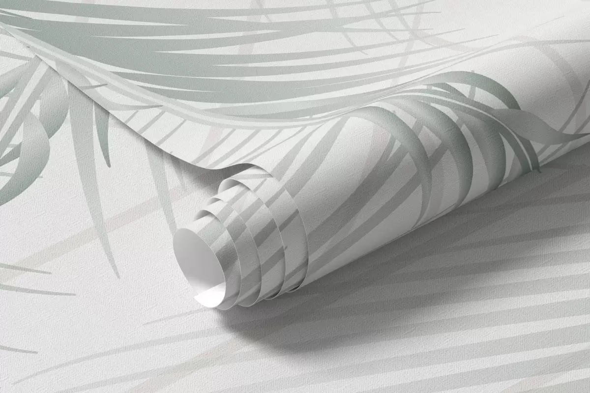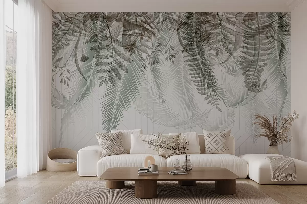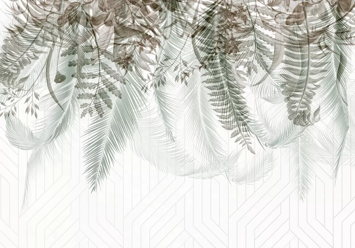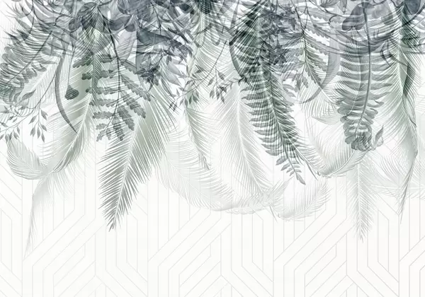 Fototapetes Smalks tropu papardes un palmu lapu kritums, ģeometriskais fons, maiga gaisma, pieklusinātas krāsas, elegants Nr. w09106v1