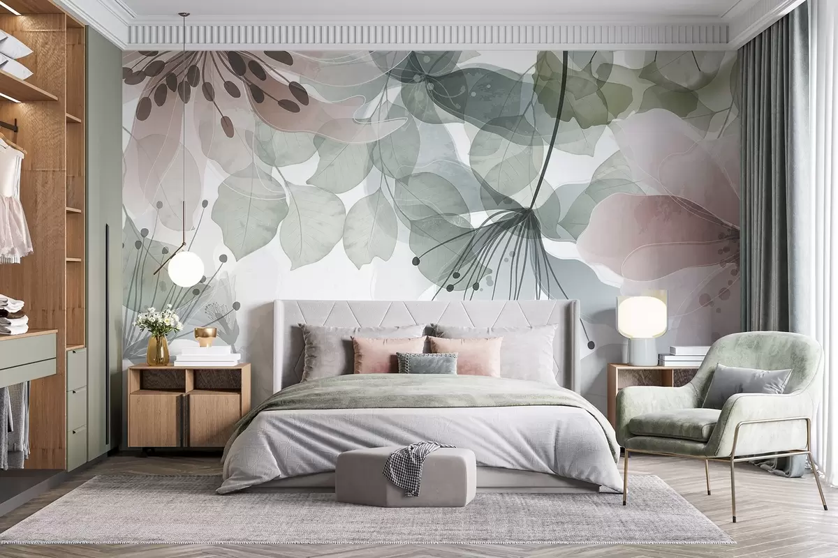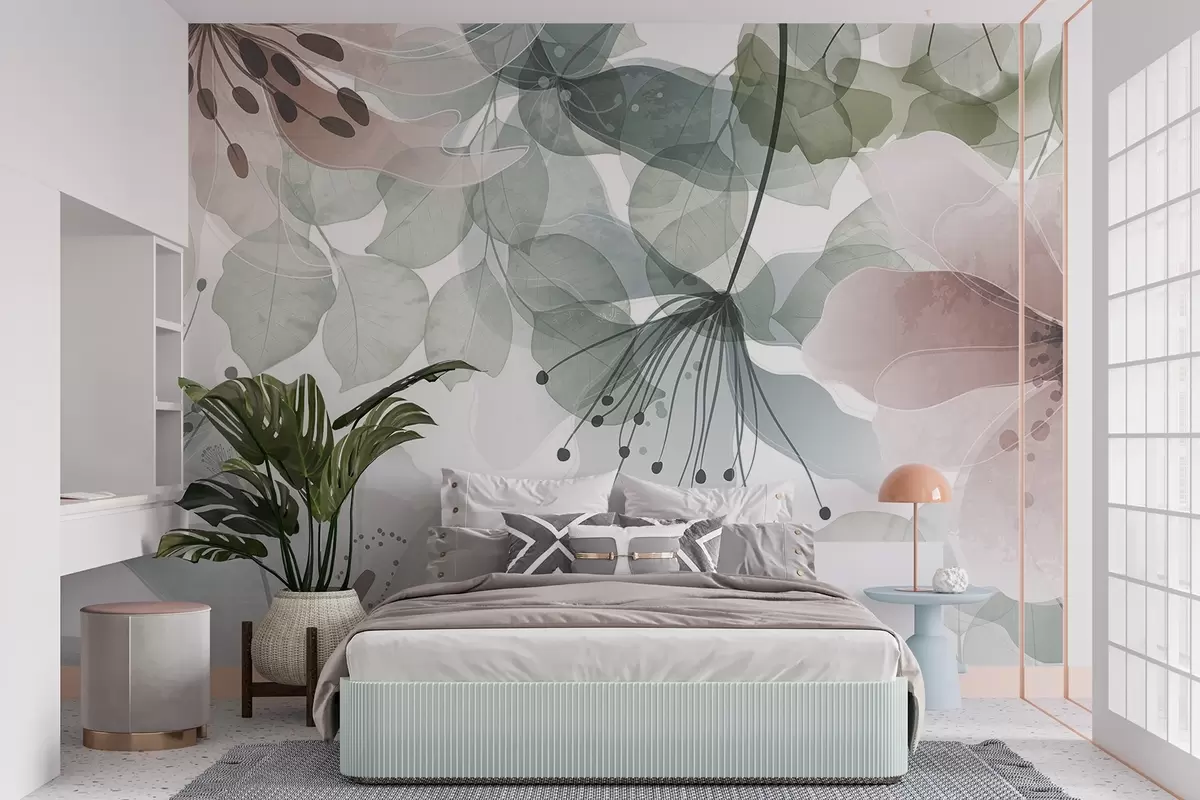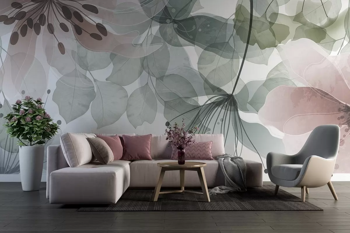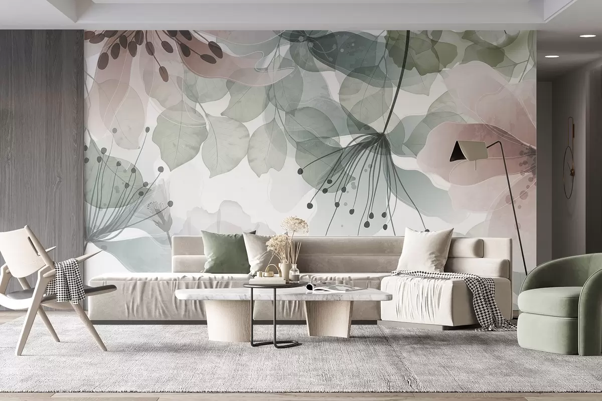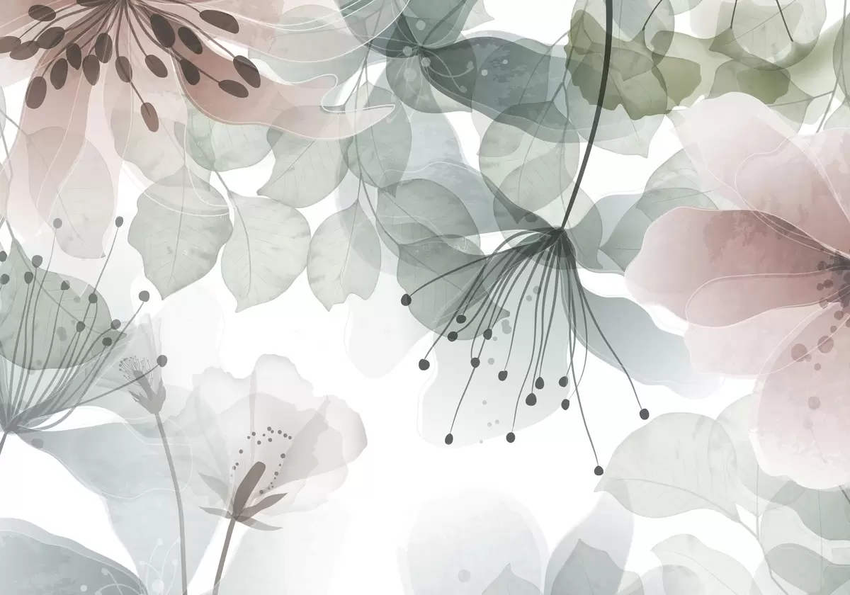 Fototapetes Ziedi un lapas pasteļtoņos, caurspīdīgas ziedlapiņas un lapas, maigs akvareļa efekts, maigas līnijas, balts fons Nr. w09107