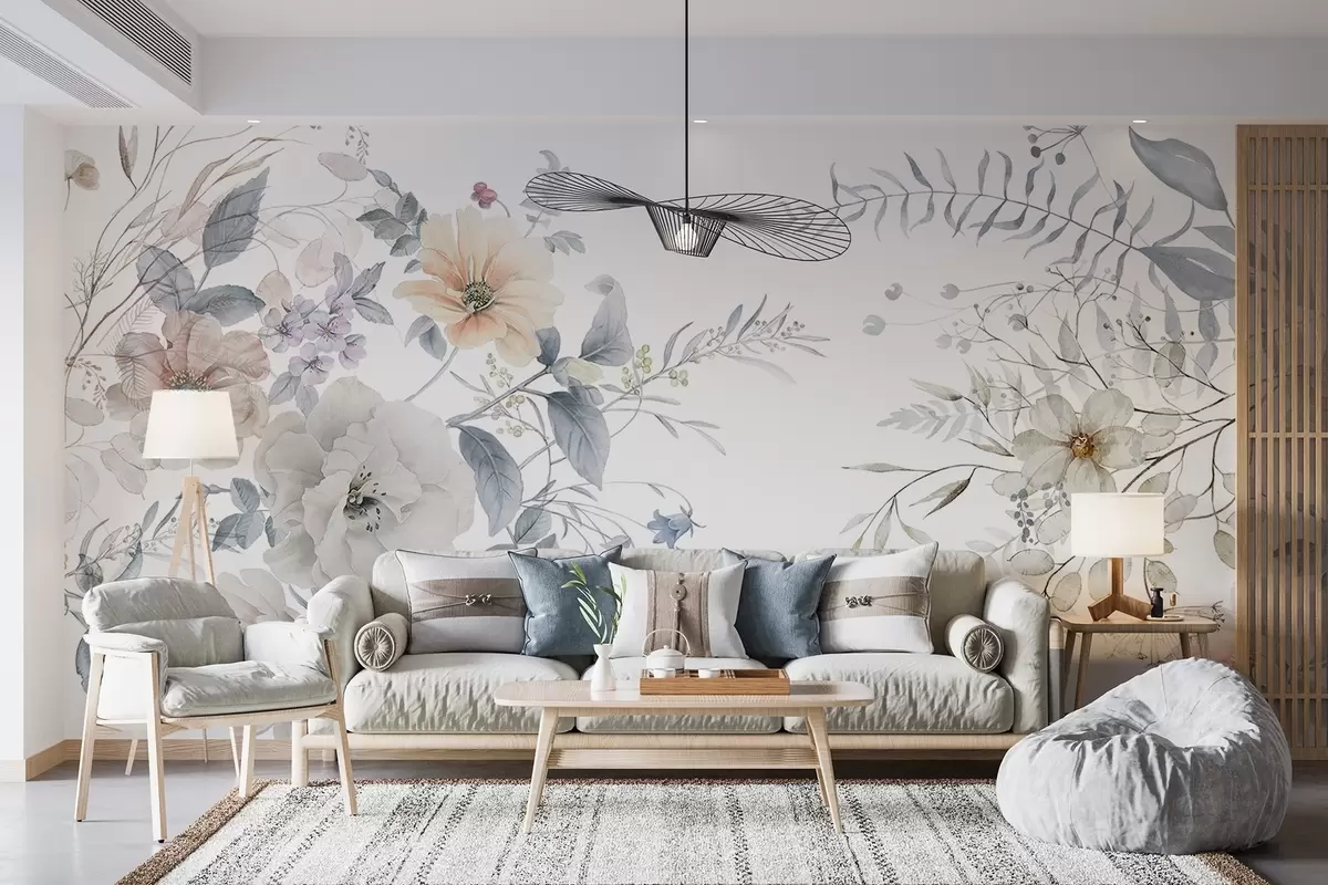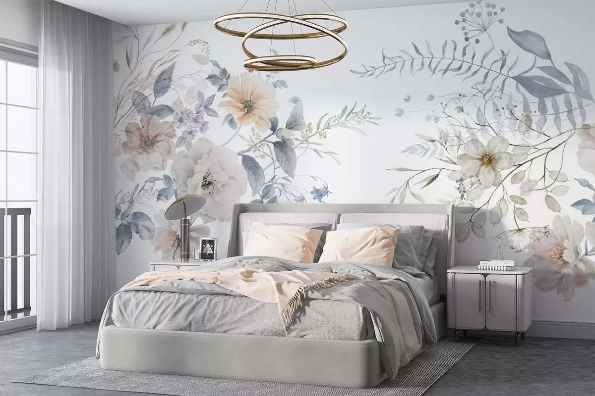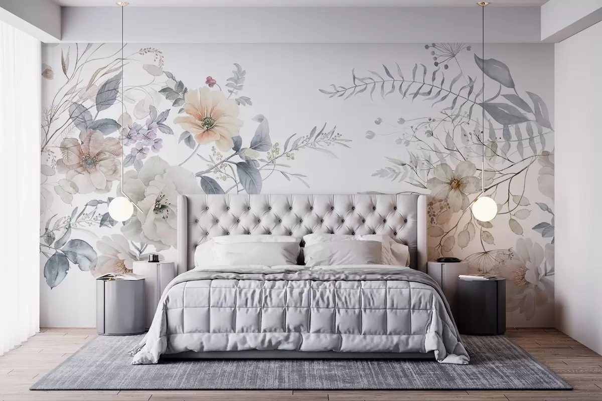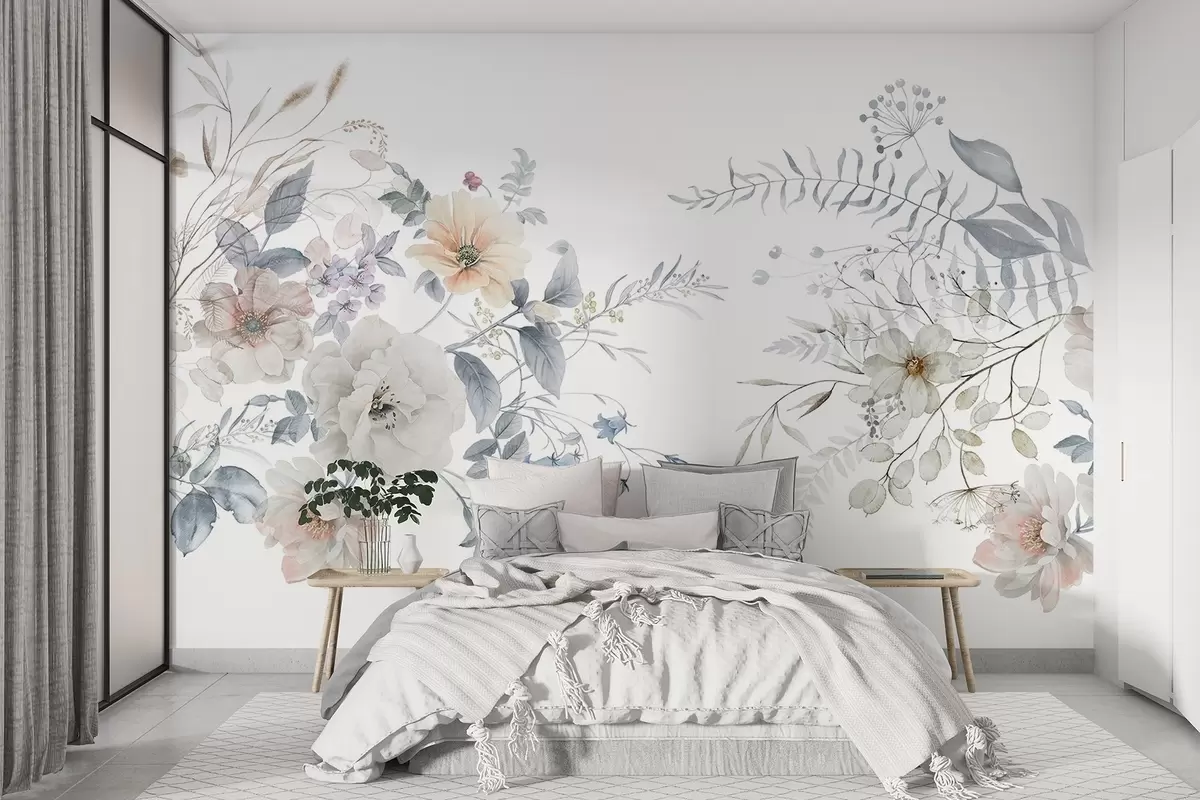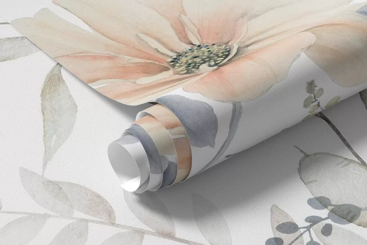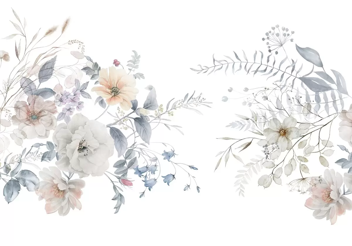 Fototapetes Ziedu kompozīcija akvareļglezniecības stilā ar baltiem, persiku un ziliem ziediem, smalkiem zaļumiem uz balta fona Nr. w09108