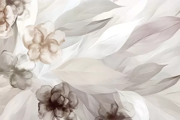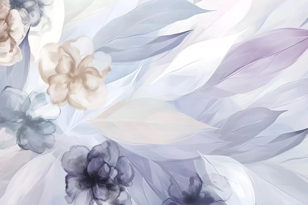 Fototapetes Smalki ziedi un lapas baltas, zilas, violetas un bēšas krāsas ziedu fonā, maigas krāsas, maigi ziedlapiņas Nr. w09111