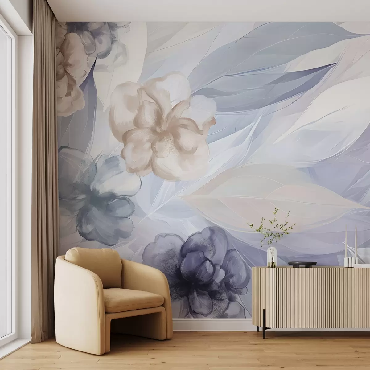 Fototapetes Smalki ziedi un lapas baltas, zilas, violetas un bēšas krāsas ziedu fonā, maigas krāsas, maigi ziedlapiņas Nr. w09111