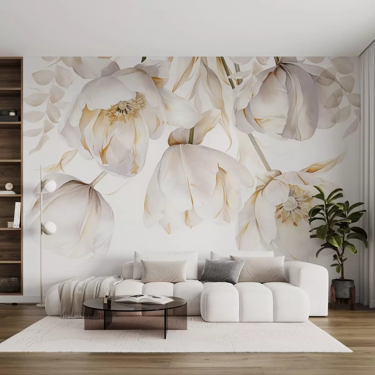 Fototapetes Baltas tulpes ar dzeltenām ziedlapiņām, maigi ziedlapiņas, eleganta ziedu kompozīcija, smalka kompozīcija, uz balta fona Nr. w09112