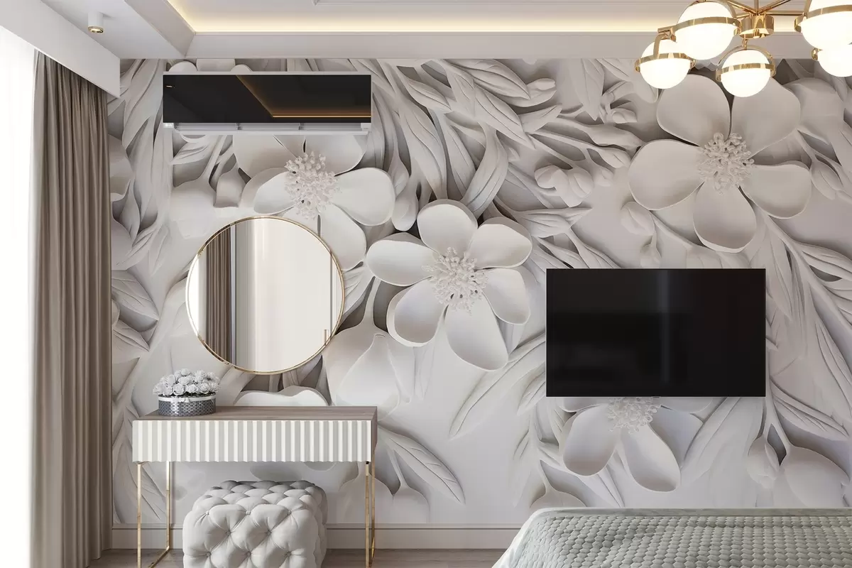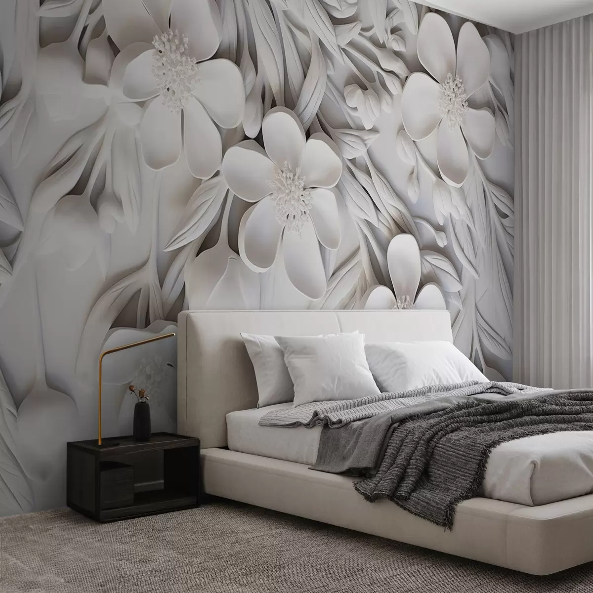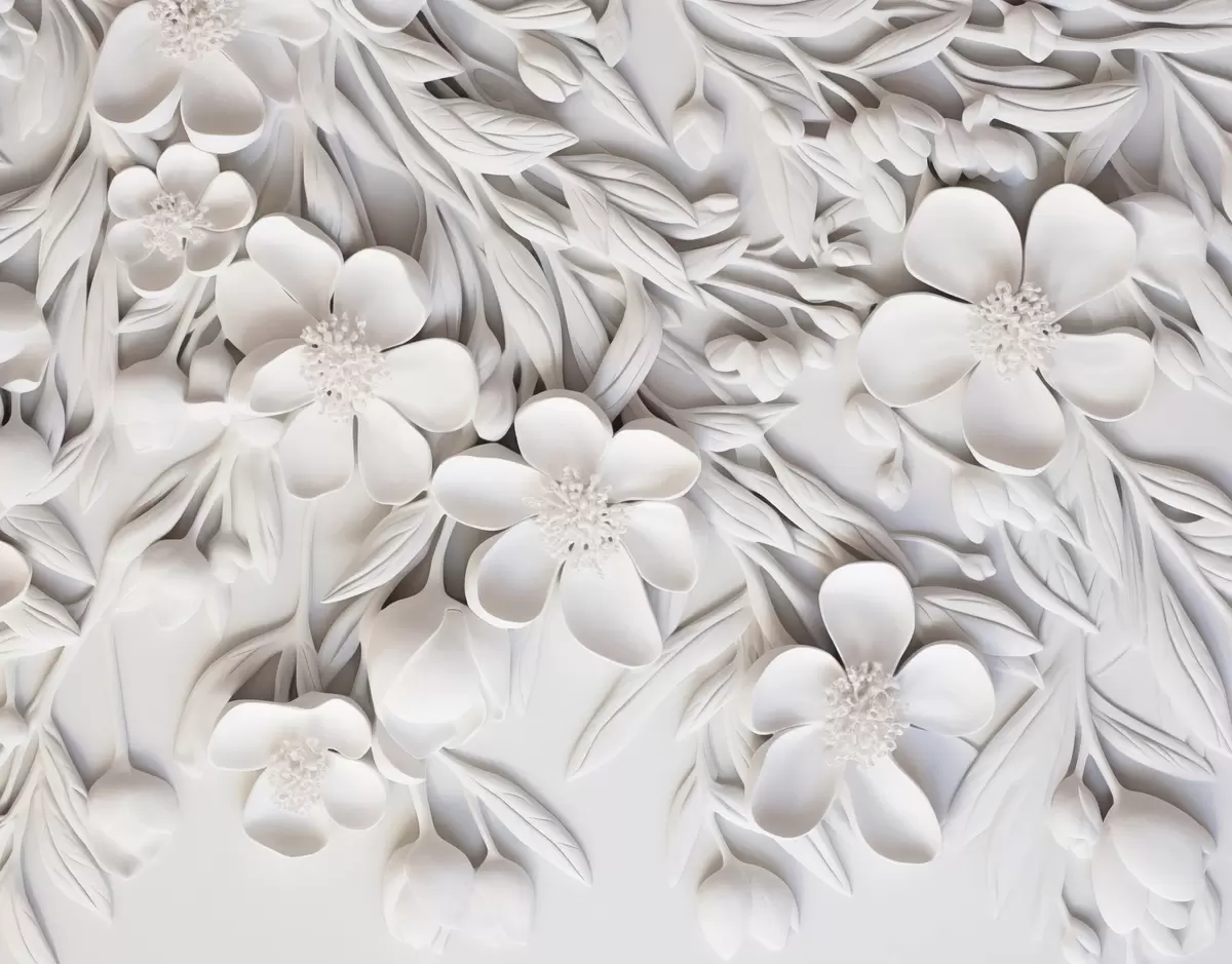 Fototapetes Balti ziedi un lapas baltā fonā, ziedu elegants, dekoratīvs dizains, sarežģītas detaļas w09113