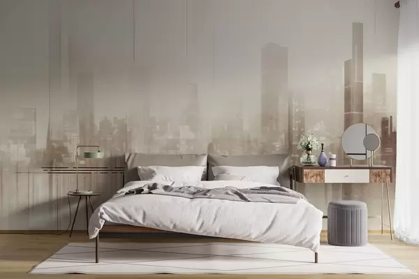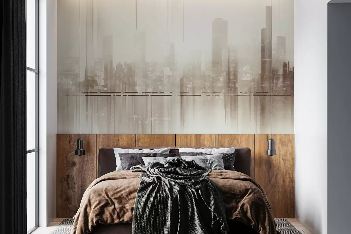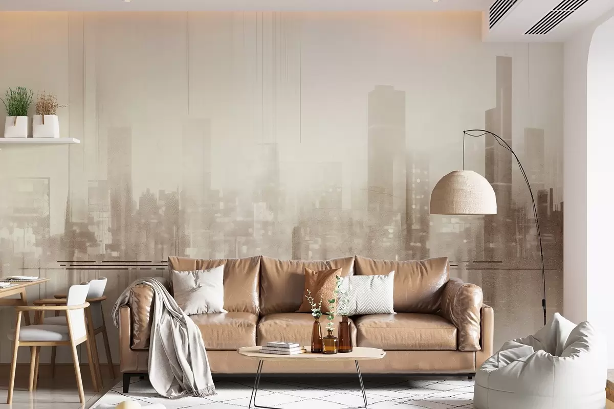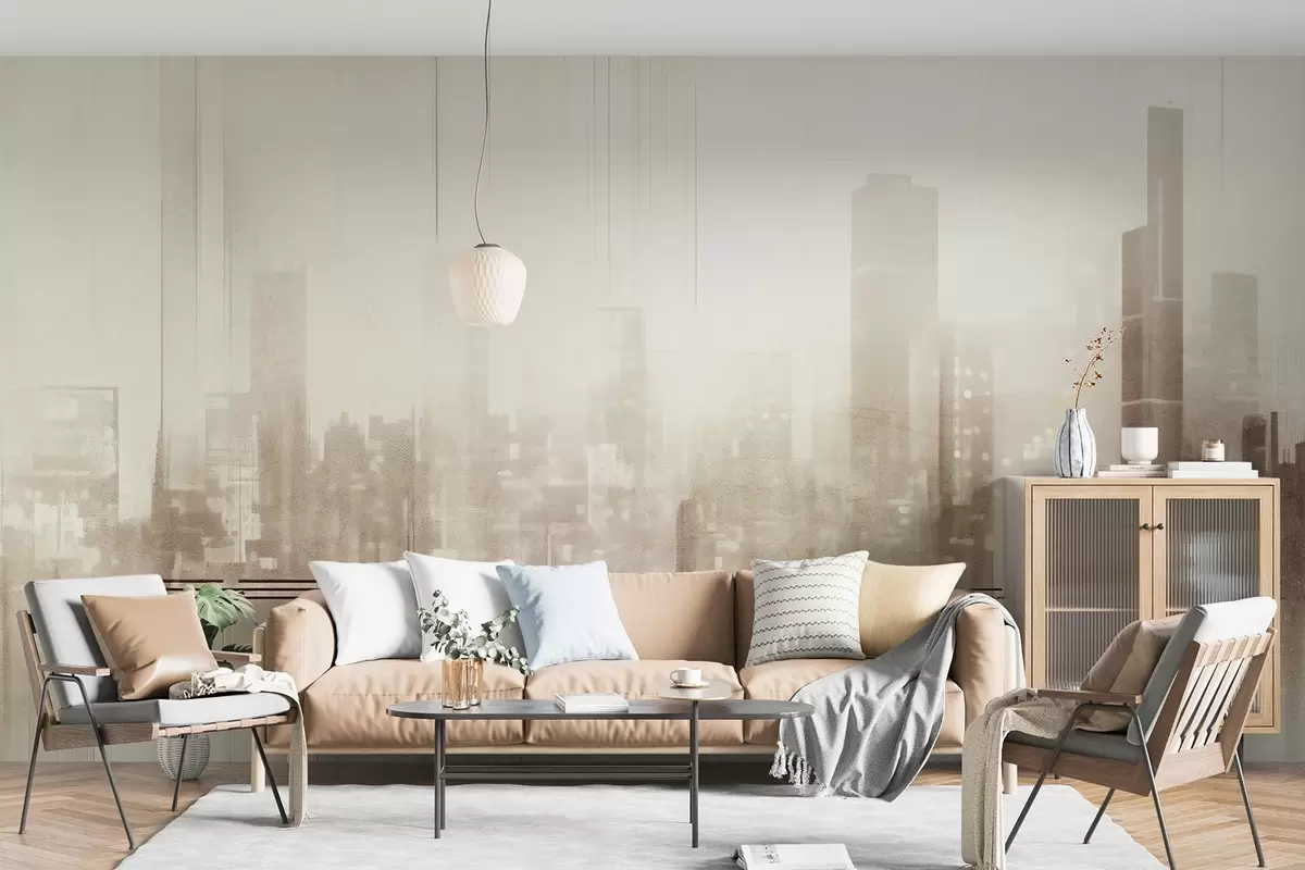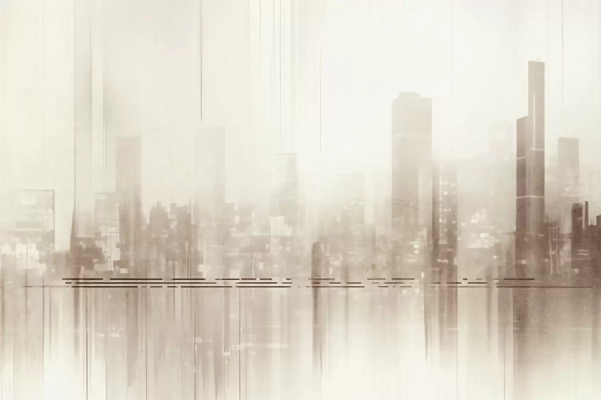 Fototapetes Abstrakta fakturēta pilsētas ainava ar augstām ēkām un joslām bēšā un baltā krāsā, kas rada miglainu efektu Nr. w09119v1