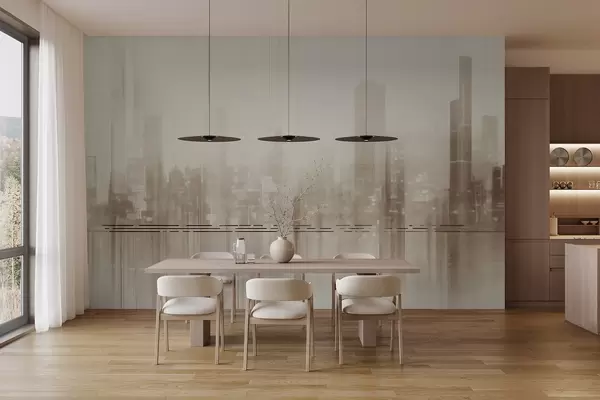 Fototapetes Abstrakta fakturēta pilsētas ainava ar augstām ēkām un joslām bēšā un baltā krāsā, kas rada miglainu efektu Nr. w09119v1
