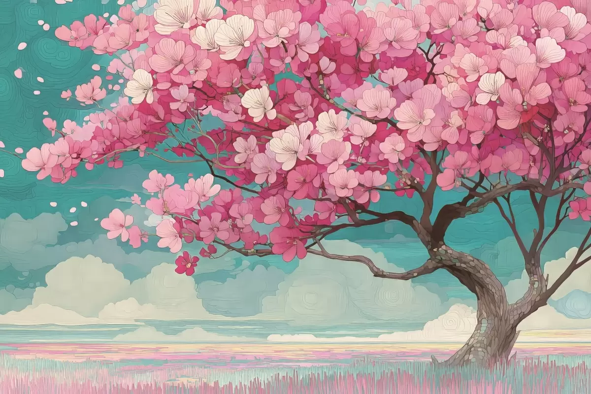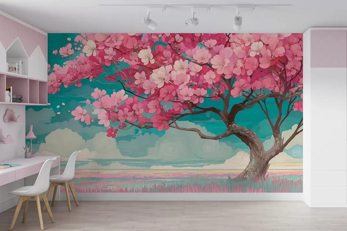 Fototapetes Rozā ķiršu ziedošs koks ar krītošām ziedlapiņām un zilām debesīm romantiskā stilā Nr. w09120