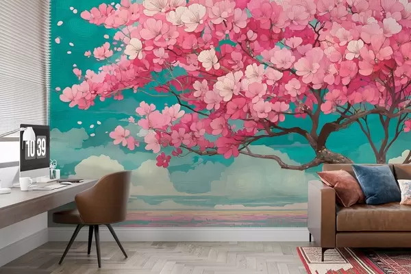 Fototapetes Rozā ķiršu ziedošs koks ar krītošām ziedlapiņām un zilām debesīm romantiskā stilā Nr. w09120