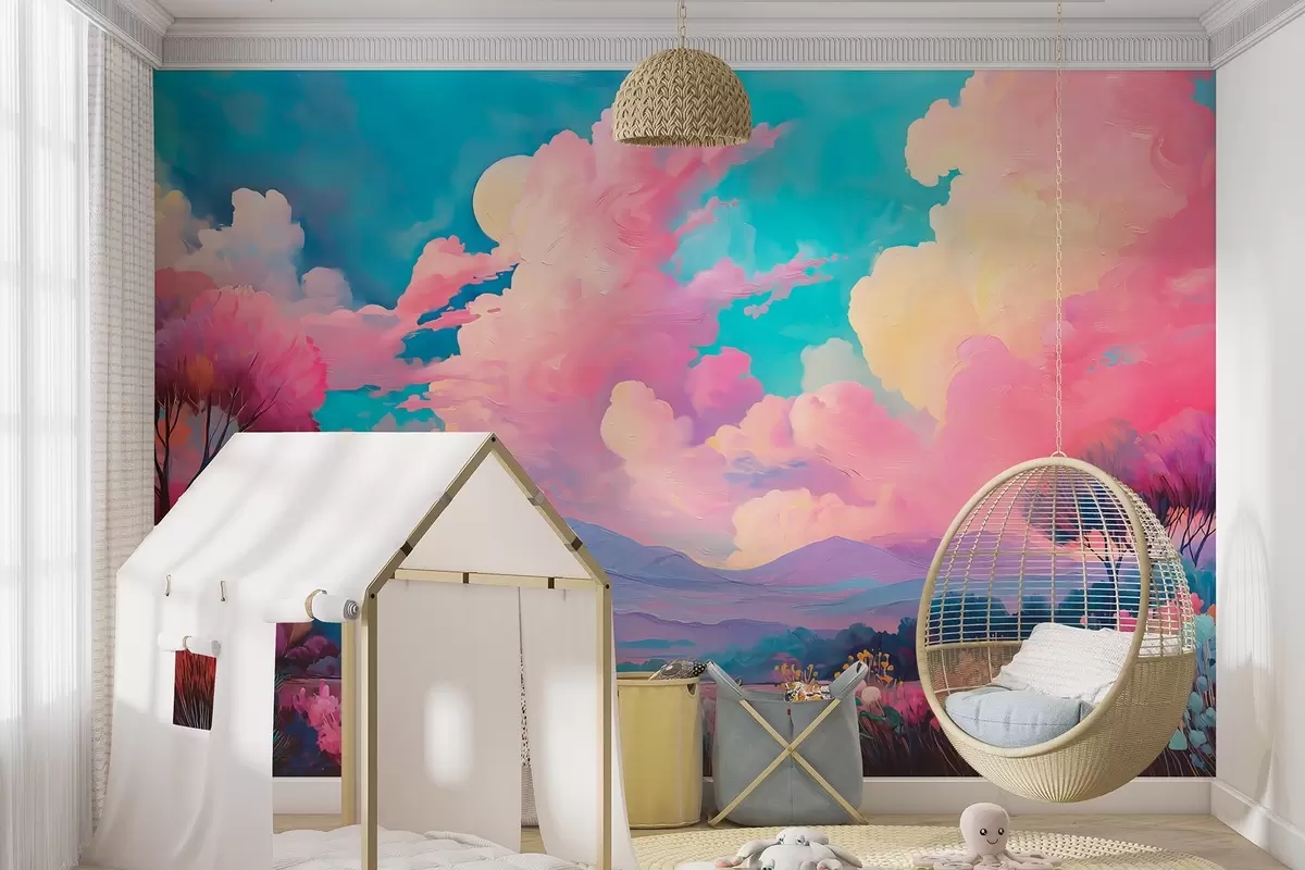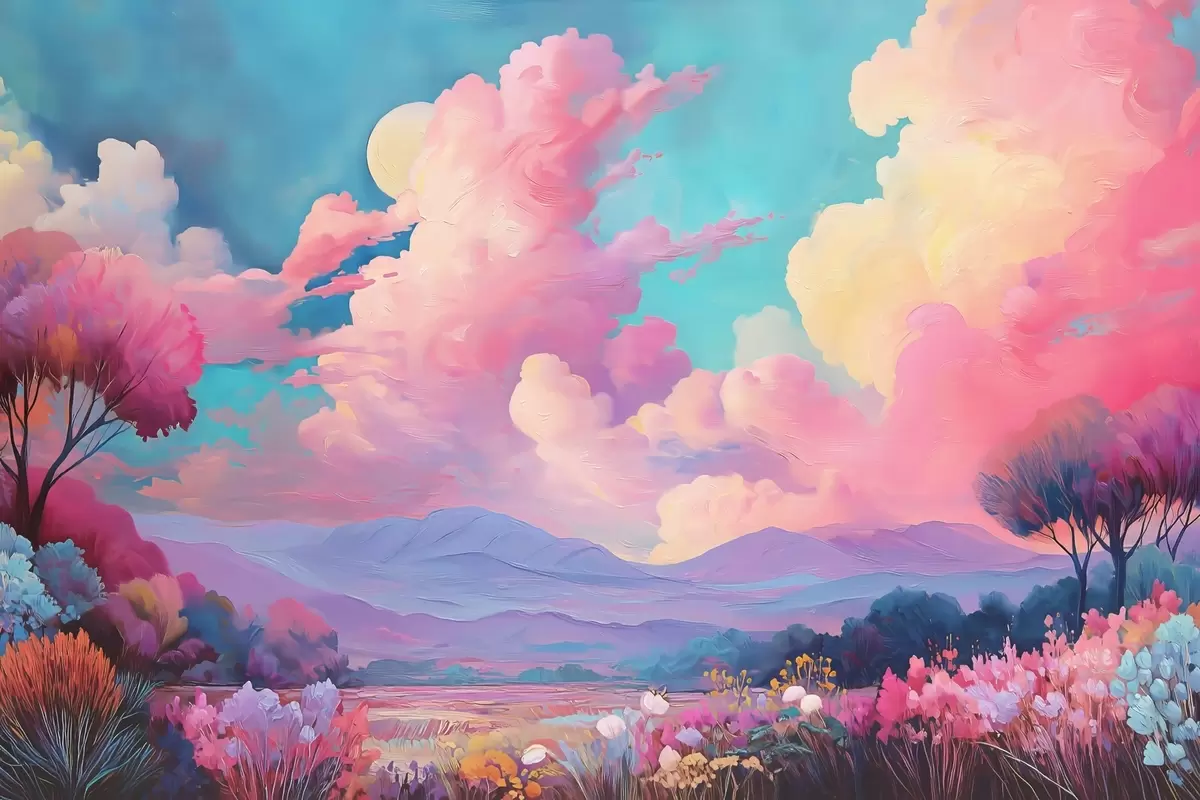 Fototapetes Krāsaina ainava eļļas glezniecības stilā ar rozā debesīm, augiem un kokiem Nr. w09123