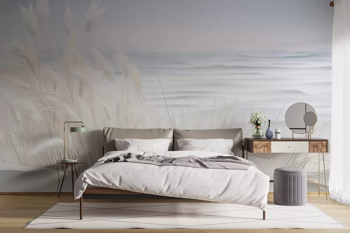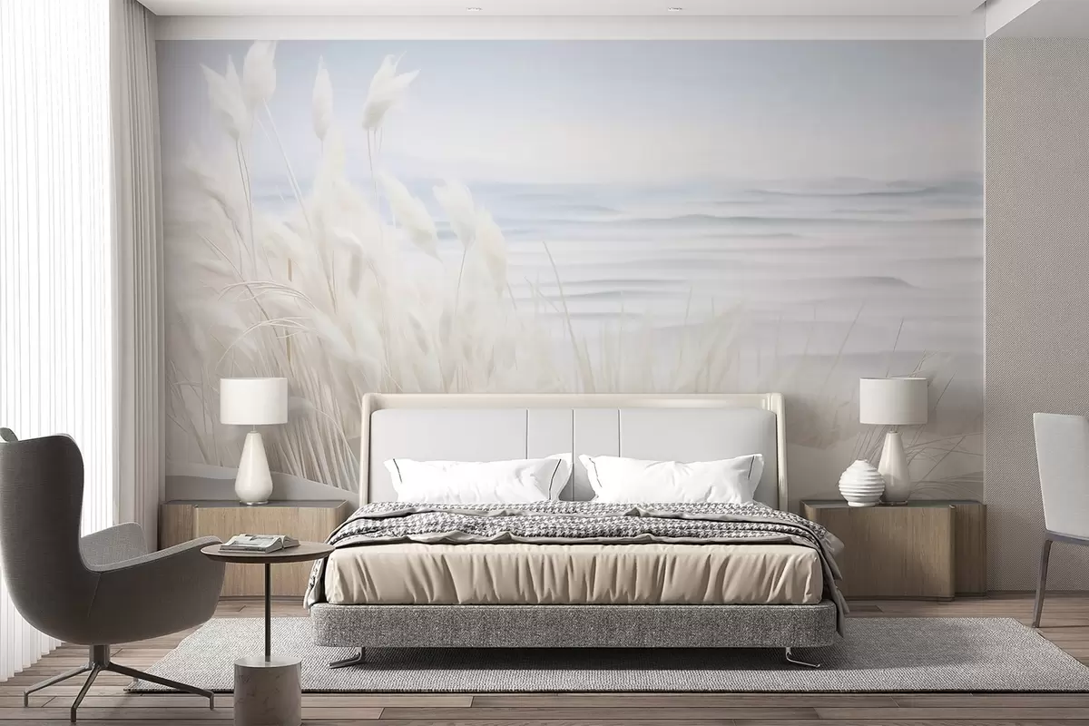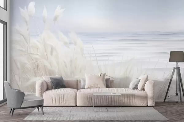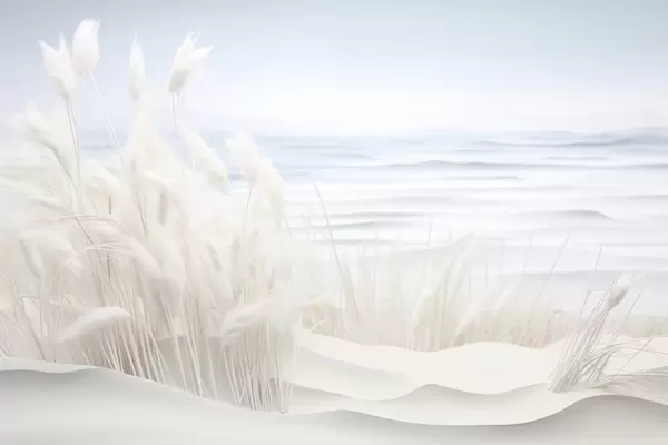Fototapetes Ainava ar baltu pampas zāli uz smilšu kāpas, ar gaiši zilu okeānu fonā, maigs, minimālisma stils Nr. w09132