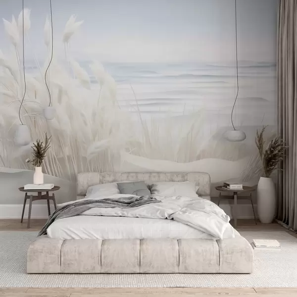 Fototapetes Ainava ar baltu pampas zāli uz smilšu kāpas, ar gaiši zilu okeānu fonā, maigs, minimālisma stils Nr. w09132