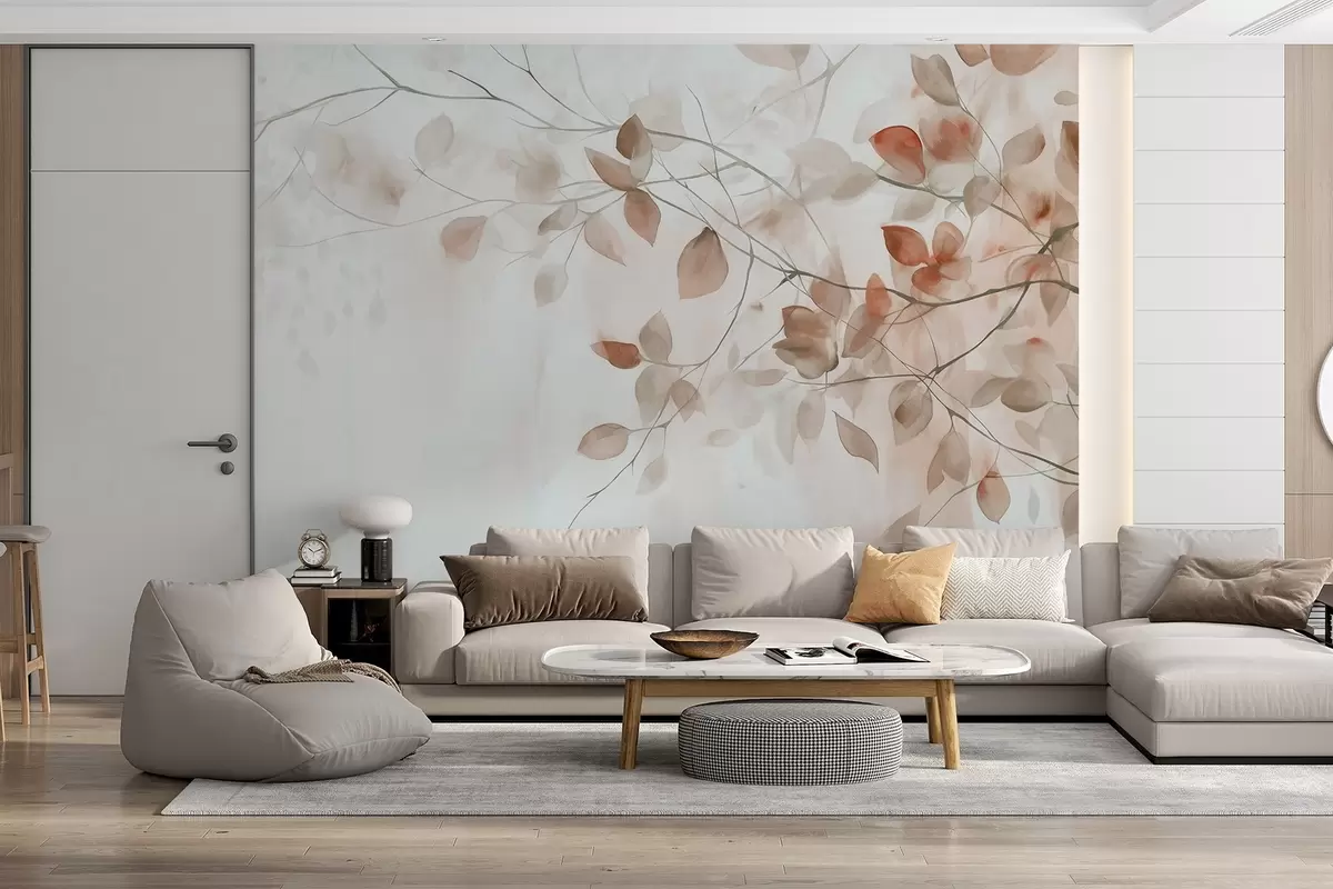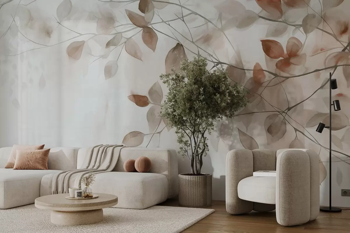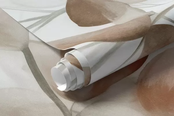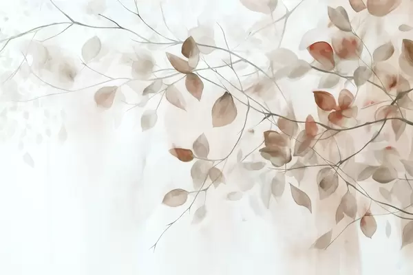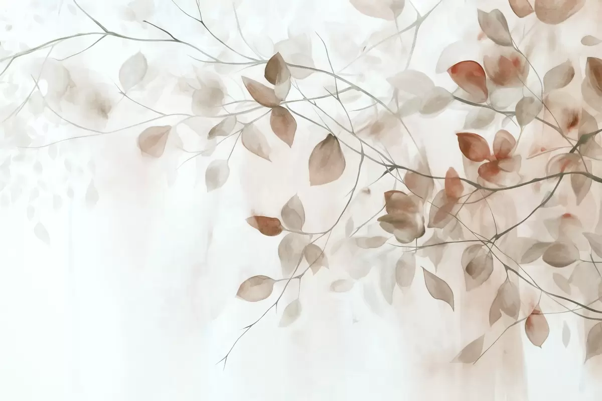 Fototapetes Brūnu lapu un zaru faktūru imitācija ar akvareli, maigas krāsas, maigas detaļas uz balta fona Nr. w09133