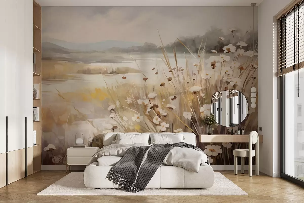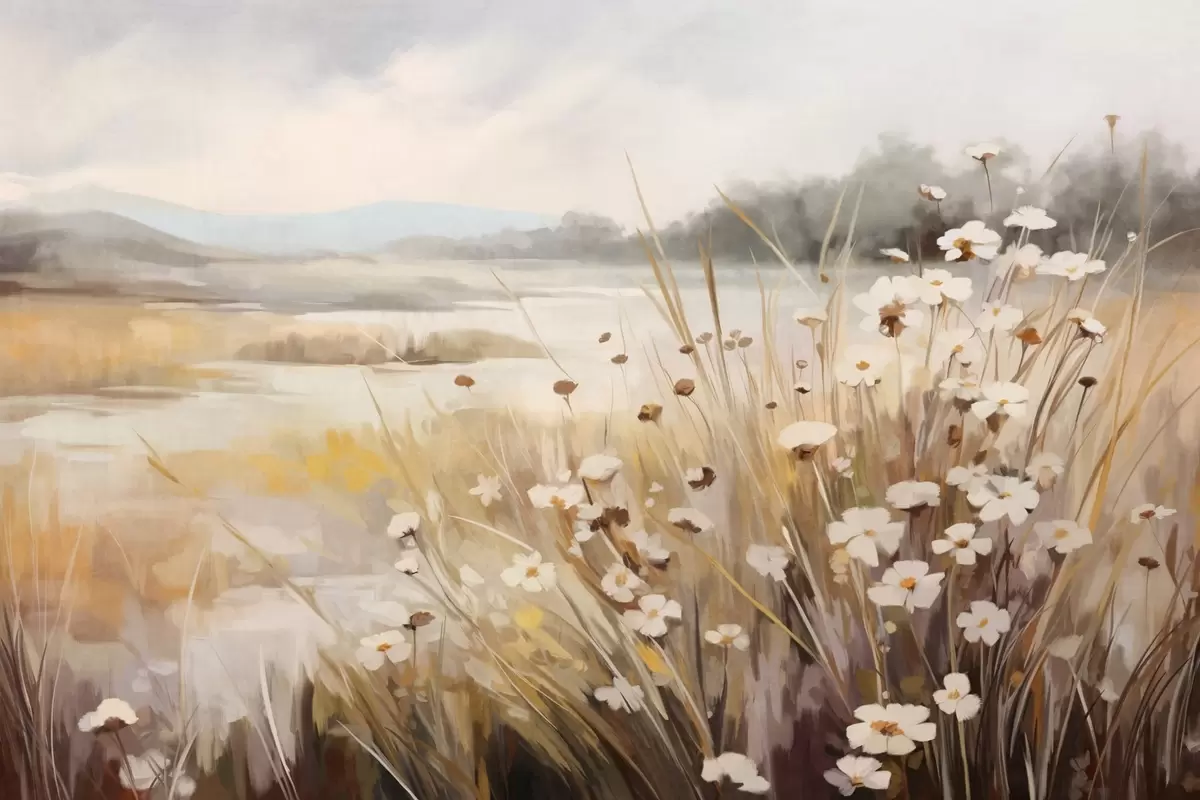 Fototapetes Augstas zāles un baltu margrietiņu lauks, koki fonā, zem mākoņainām debesīm, teksturēta ainava, maigi triepieni ar otu Nr. w09139