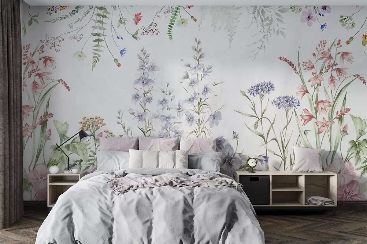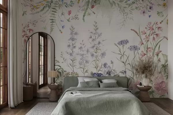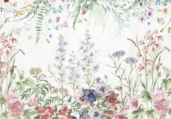 Fototapetes Ziedu tekstūras kompozīcija ar krāsainiem ziediem un zaļām lapām, botāniska ilustrācija , maigas pasteļtoņi, vintage stils Nr. w09143