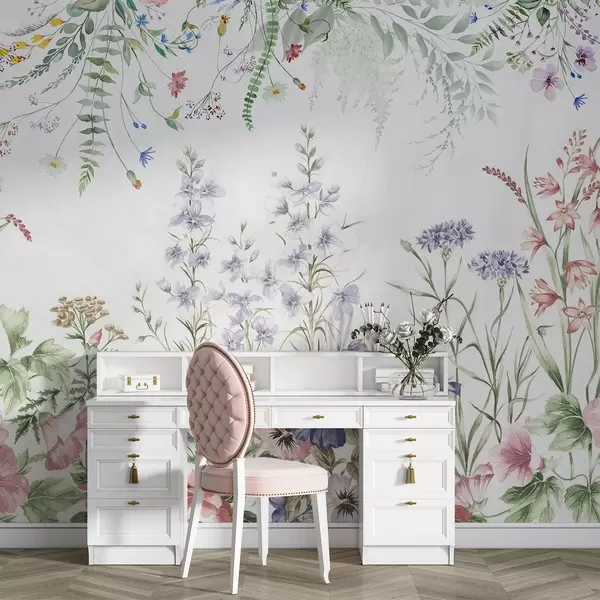 Fototapetes Ziedu tekstūras kompozīcija ar krāsainiem ziediem un zaļām lapām, botāniska ilustrācija , maigas pasteļtoņi, vintage stils Nr. w09143