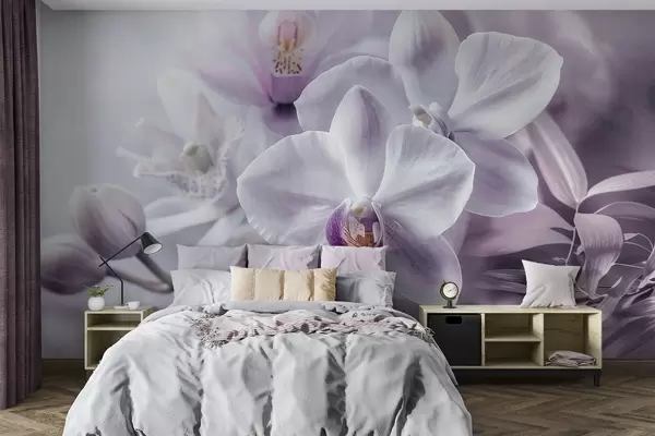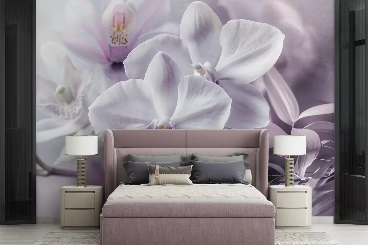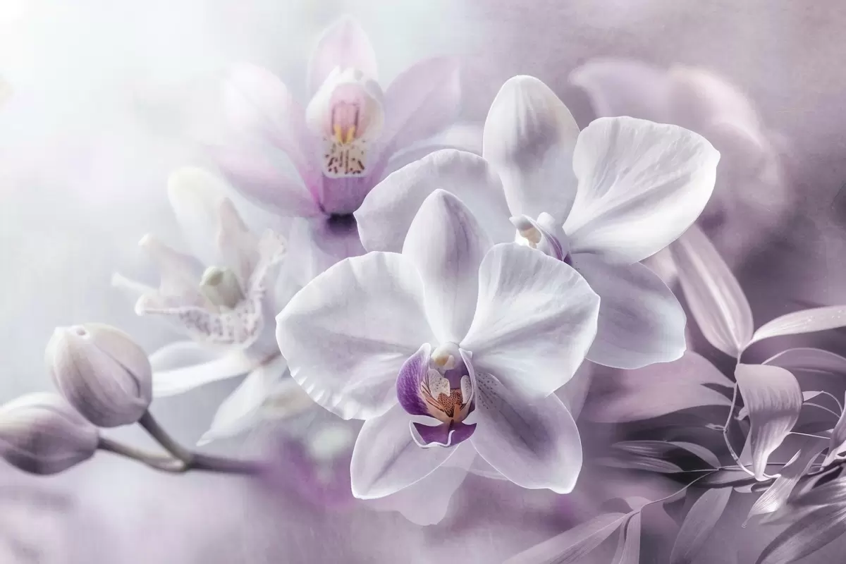 Fototapetes Balti un ceriņi maigi orhideju ziedi, maigs apgaismojums un neskaidrs teksturēts fons Nr. w09155