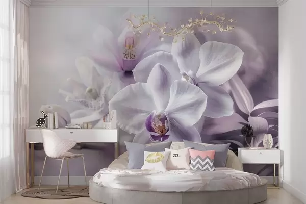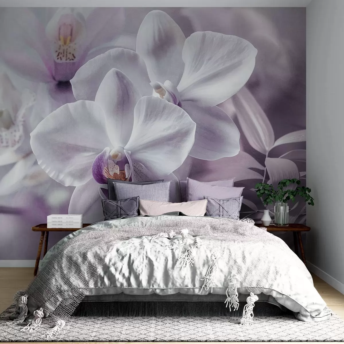 Fototapetes Balti un ceriņi maigi orhideju ziedi, maigs apgaismojums un neskaidrs teksturēts fons Nr. w09155