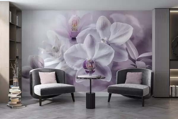 Fototapetes Balti un ceriņi maigi orhideju ziedi, maigs apgaismojums un neskaidrs teksturēts fons Nr. w09155
