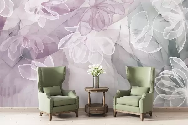 Fototapetes Ziedi un lapas ar caurspīdīgām ziedlapiņām baltos, rozā un zaļos toņos, maigi un maigi Nr. w09158v1