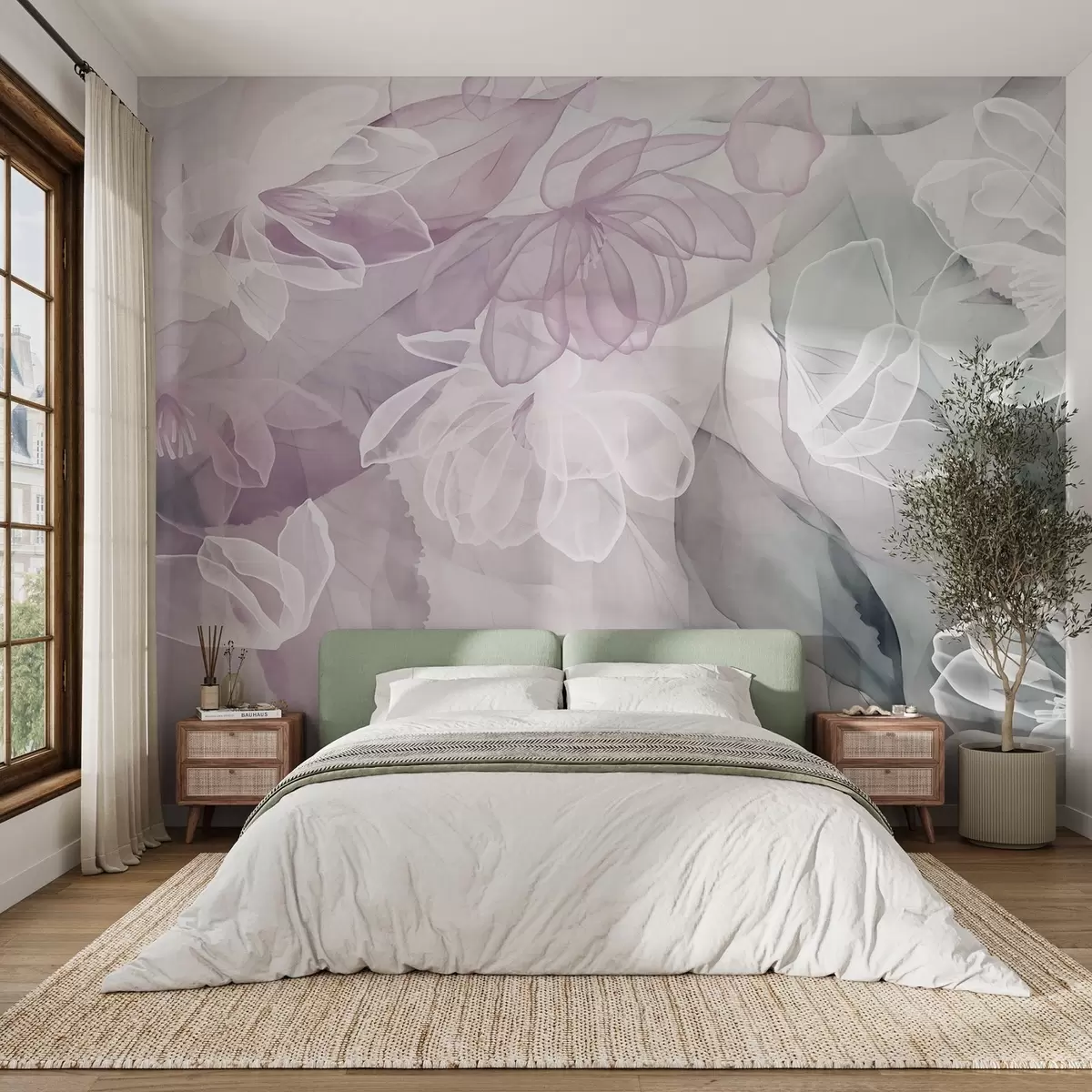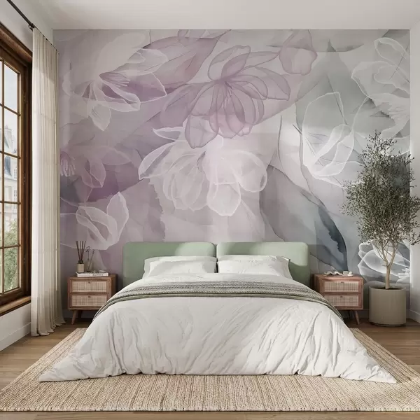 Fototapetes Ziedi un lapas ar caurspīdīgām ziedlapiņām baltos, rozā un zaļos toņos, maigi un maigi Nr. w09158v1