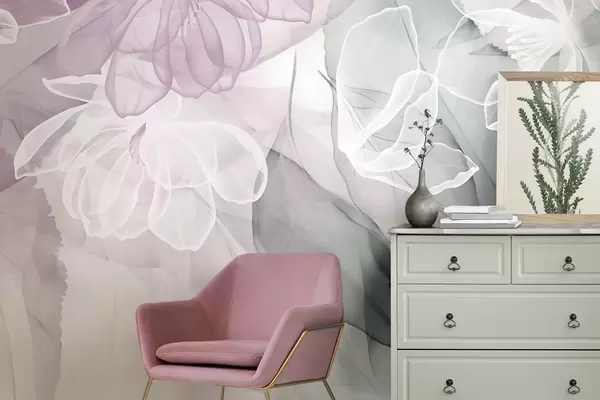Fototapetes Ziedi un lapas ar caurspīdīgām ziedlapiņām baltos, rozā un zaļos toņos, maigi un maigi Nr. w09158v1