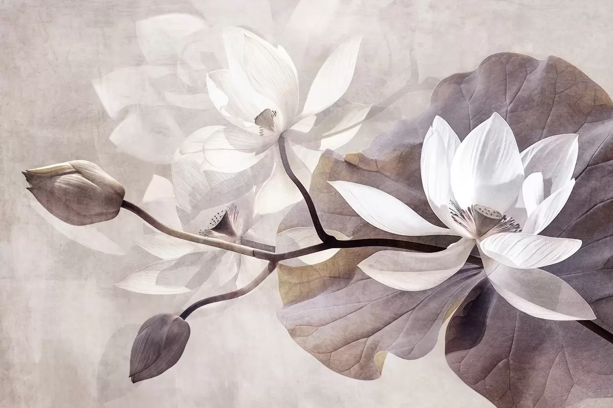 Fototapetes Graudainas faktūras, piesātināti, maigi smalki lotosa ziedi ar lapām un stublājiem maigā, bēšā krāsu paletē Nr. w09159
